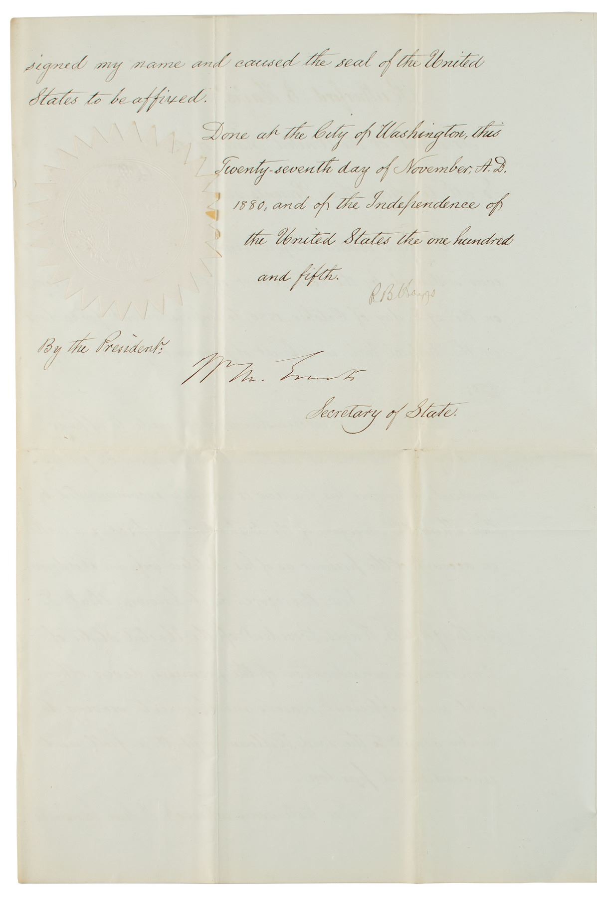 Manuscript DS as president, signed “R. B. Hayes,” one page, 10.25 x 15.5, November 27, 1880. Pardon document, in part: "Whereas, William Tippett, on conviction of assault, was sentenced by the Police Court of the District of Columbia…And whereas, circumstances are made to appear evincing that he was at the time hardly responsible for his conduct, wherefore his pardon is earnestly recommended by Hon: Thomas P. Morgan, of the District Commissioners, as well as on account of the prisoner as of his destitute wife and children…I, Rutherford B. Hayes, President of the United States of America…hereby grant to the said William tippett, a full and unconditional pardon." Signed at the conclusion by President Hayes and countersigned by Secretary of State William M. Evarts. The white paper seal affixed to the left side remains fully intact. In very good to fine condition, with heavy intersecting folds, and the signature a couple of shades light.