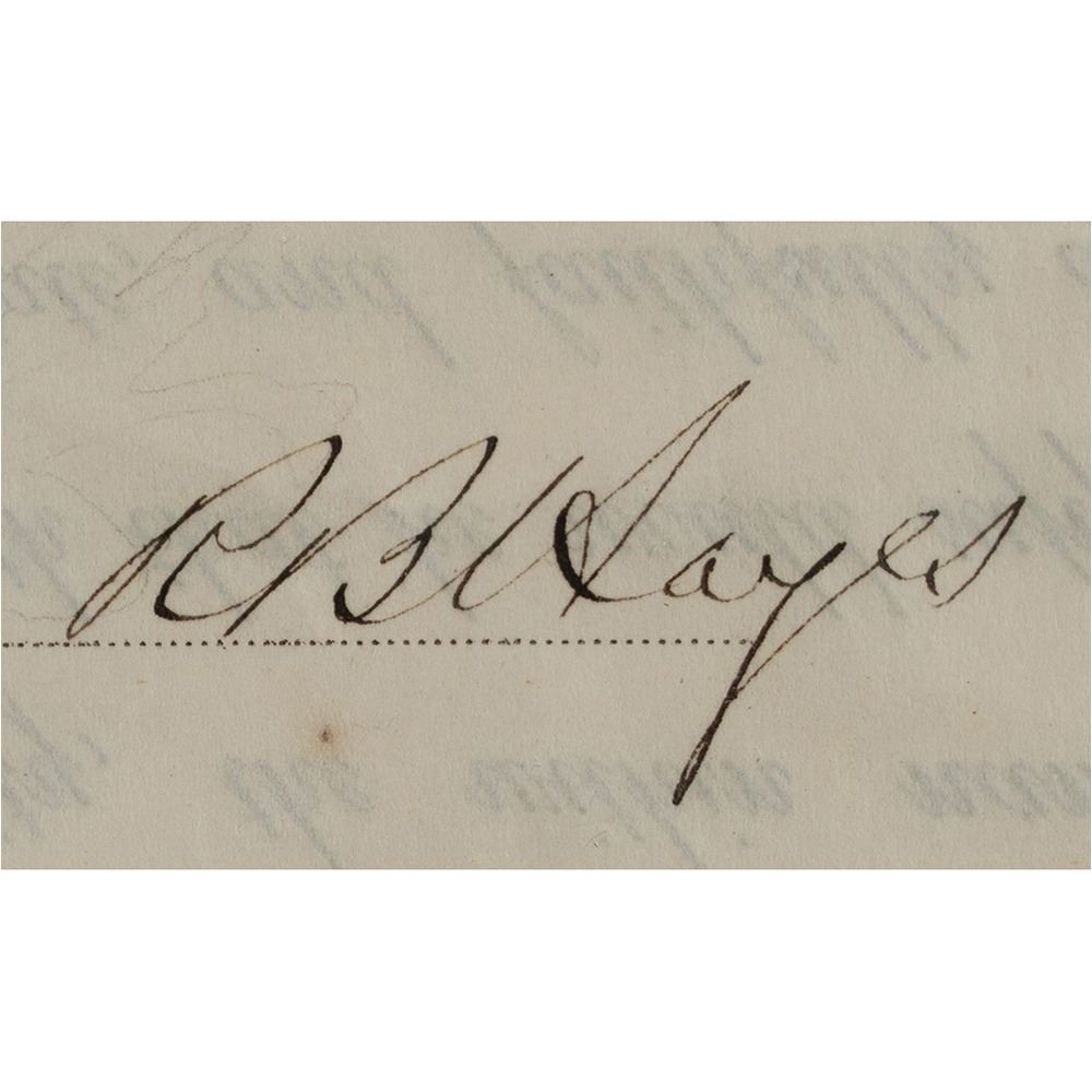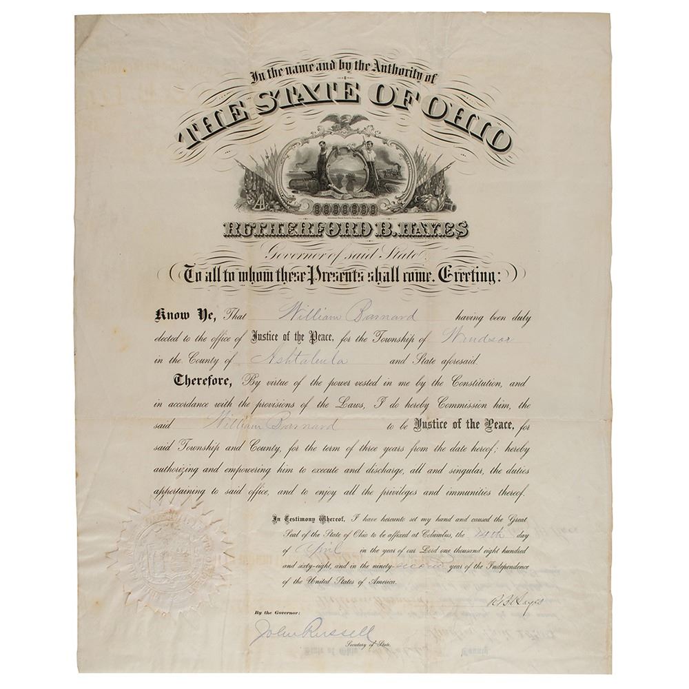 Partly-printed DS, signed “R. B. Hayes,†one page, 14 x 17, February 14, 1868. As Governor of Ohio, Hayes appoints William Barnard as a "Justice of the Peace, for the Township of Windsor in the County of Ashtabula." Signed neatly at the conclusion by Rutherford B. Hayes. Lower left bears the original off-white seal. In very good to fine condition, with intersecting folds, and light wrinkling and creasing. A decidedly early document from Hayes's second month as the Governor of Ohio; he'd serve a second, much shorter term as governor from January 10, 1876 until March 2, 1877, before heading to the White House as the nation's 19th president. Hayes is one of seven presidents to call the state of Ohio home.