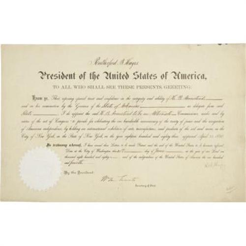 <B>Rutherford B. Hayes Document Signed</B></I> "<I>R B Hayes</B></I>", countersigned by Secretary of State William Evarts, one page, partially printed, 17" x 11", Washington, D.C., June 23, 1880, a presidential appointment naming H. B. Armistead of Arkansas an "<I>Alternate Commissioner, under and by virtue of the act of Congress 'to provide for celebrating the one hundredth anniversary of the treaty of peace and the recognition of American independence, by holding an international exhibition of arts, manufactures, and products of the soil and mine...' in the City of New York...</B></I>". Affixed with embossed presidential seal. Old repair to upper right corner, even toning, a few ink stains on upper edge. Very good condition. Lot includes cabinet card engraving of Hayes.<BR><BR><b>Shipping:</b> Flat Material, Small (<a target="_blank" href="http://www.heritageauctions.com/common/shipping.php">view shipping information</a>)