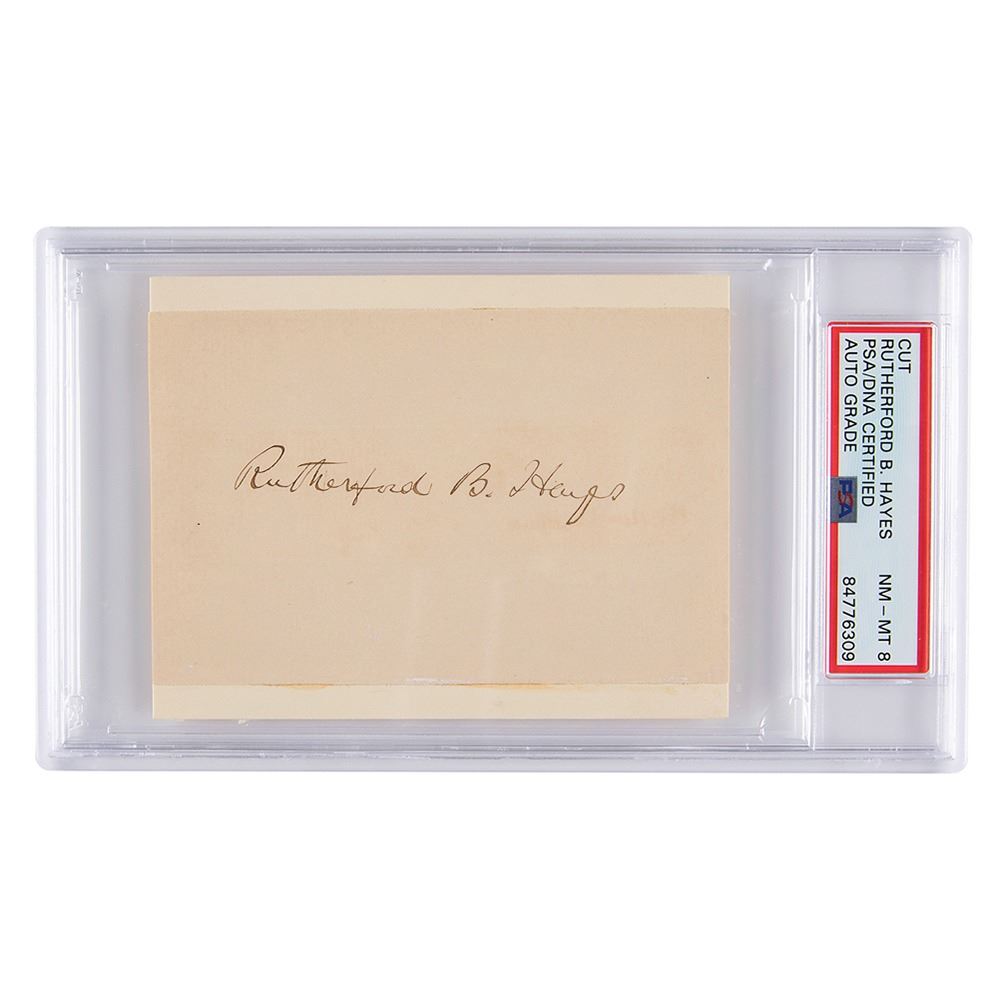 Neat ink signature, "Rutherford B. Hayes,& rdquo; on an off-white 4.5 x 3 card. Affixed to a slightly larger card and in fine condition. Encapsulated and graded by PSA/DNA as "NM-MT 8."