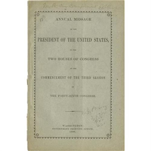 <B>Rutherford B. Hayes Signed Annual Message</B></I> (Washington, D.C.: Government Printing Office, 1880), 34 pages, 8vo (5.75” x 9.25”). Rutherford Birchard Hayes (1822-1893) became the 19th President of the United States by virtue of one electoral vote following a hotly contested election in which he actually lost the popular count by 250,000 votes. This pamphlet is inscribed on the front cover in the top margin <I>“With my compliments R B Hayes”</B></I> The cover is partially split at the spine and stained on the back; the inscription and signature have faded. <I>From the collection of Henry E. Luhrs.</B></I><I>.</B></I> <BR><BR><b>Shipping:</b> Flat Material, Small (<a target="_blank" href="http://www.heritageauctions.com/common/shipping.php">view shipping information</a>)