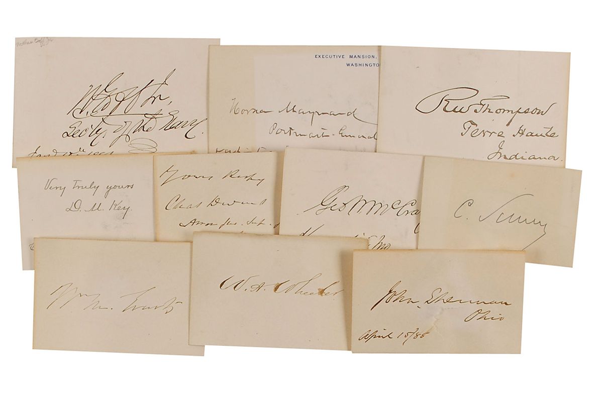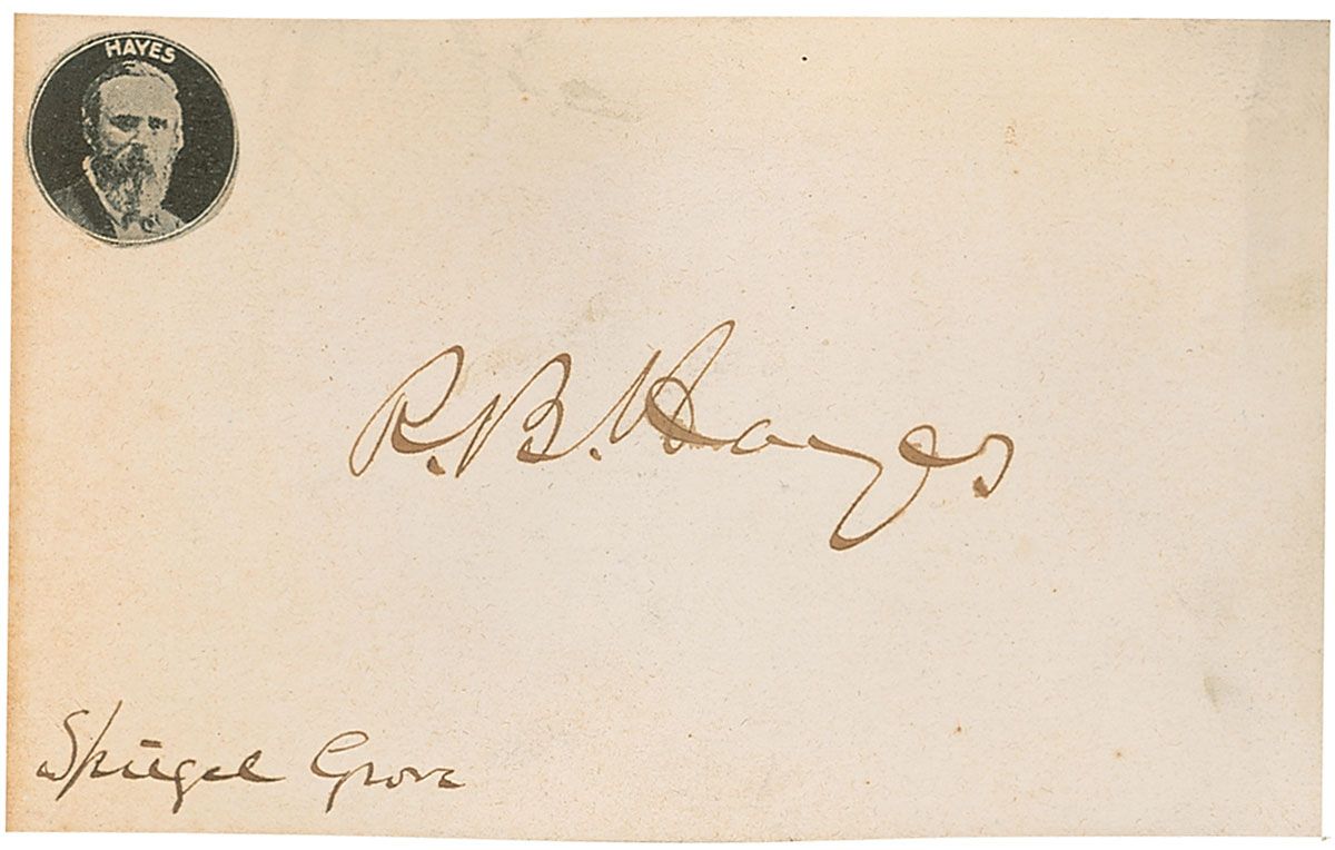 Ink signature, “R. B. Hayes, Spiegel Grove,” on an off-white 4 x 2.5 card with clipped portrait affixed to the upper left. Light overall toning and soiling, light rippling, and mounting remnants to reverse, otherwise fine condition. Accompanied by 10 cards, each signed by a member of his cabinet. Signers are: Carl Schurz, Charles Devens, William M. Evarts, William A. Wheeler, John Sherman, George W. McCrary, David M. Key, Richard W. Thompson, Horace Maynard, and Nathan Goff, Jr. In overall very good to fine condition, with various scattered toning, soiling, and light rippling, and a tear to one card.