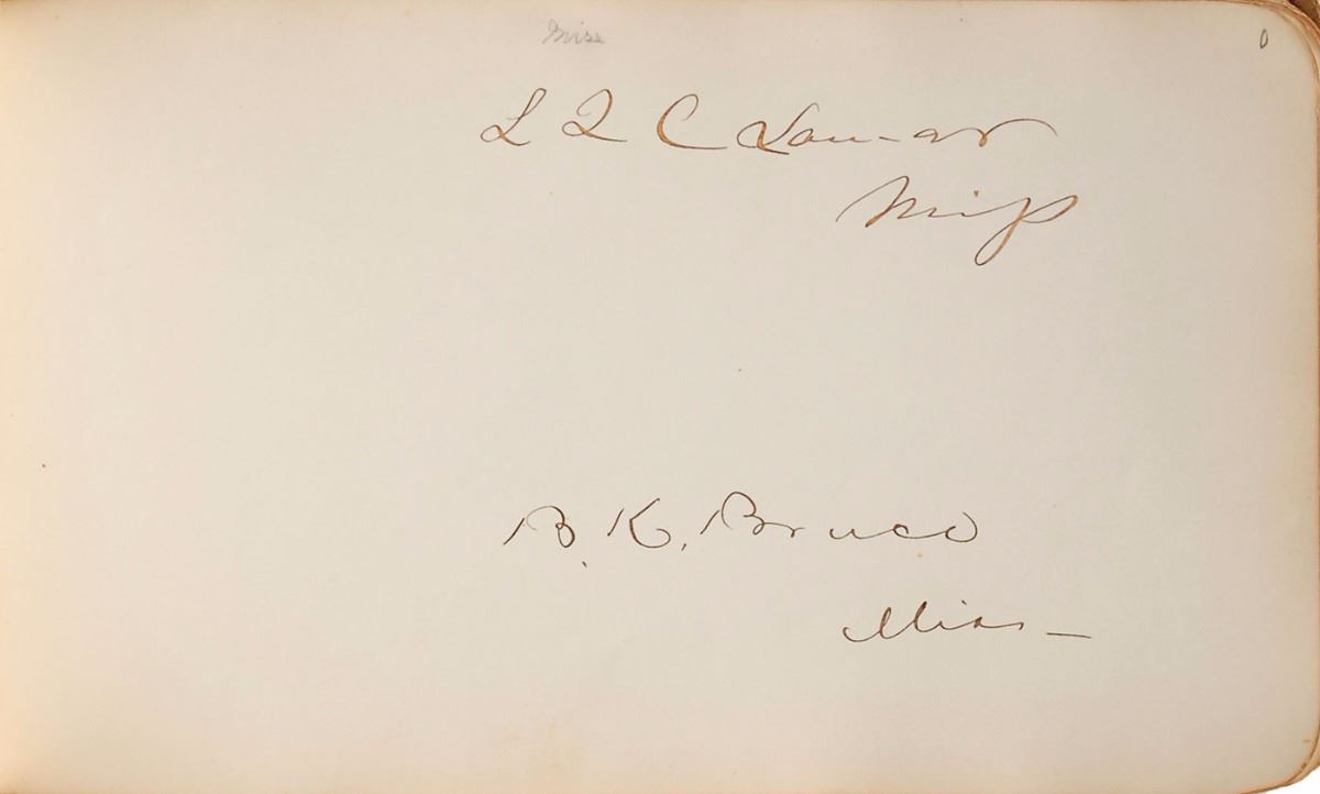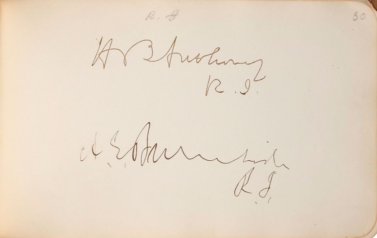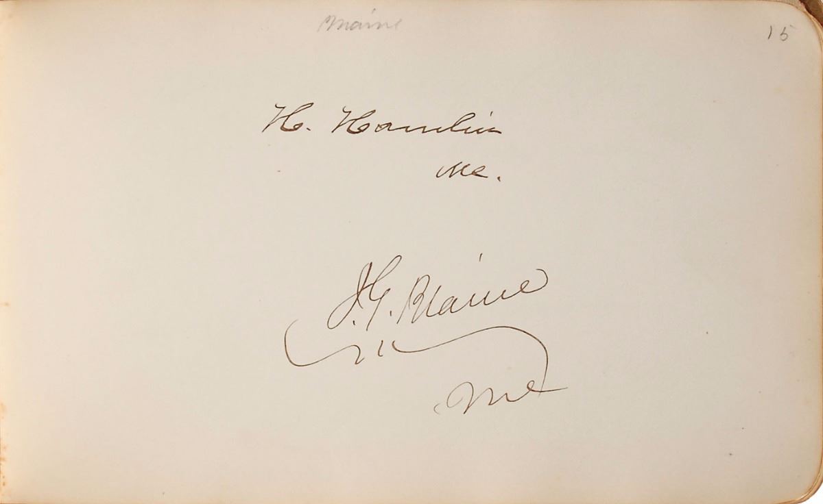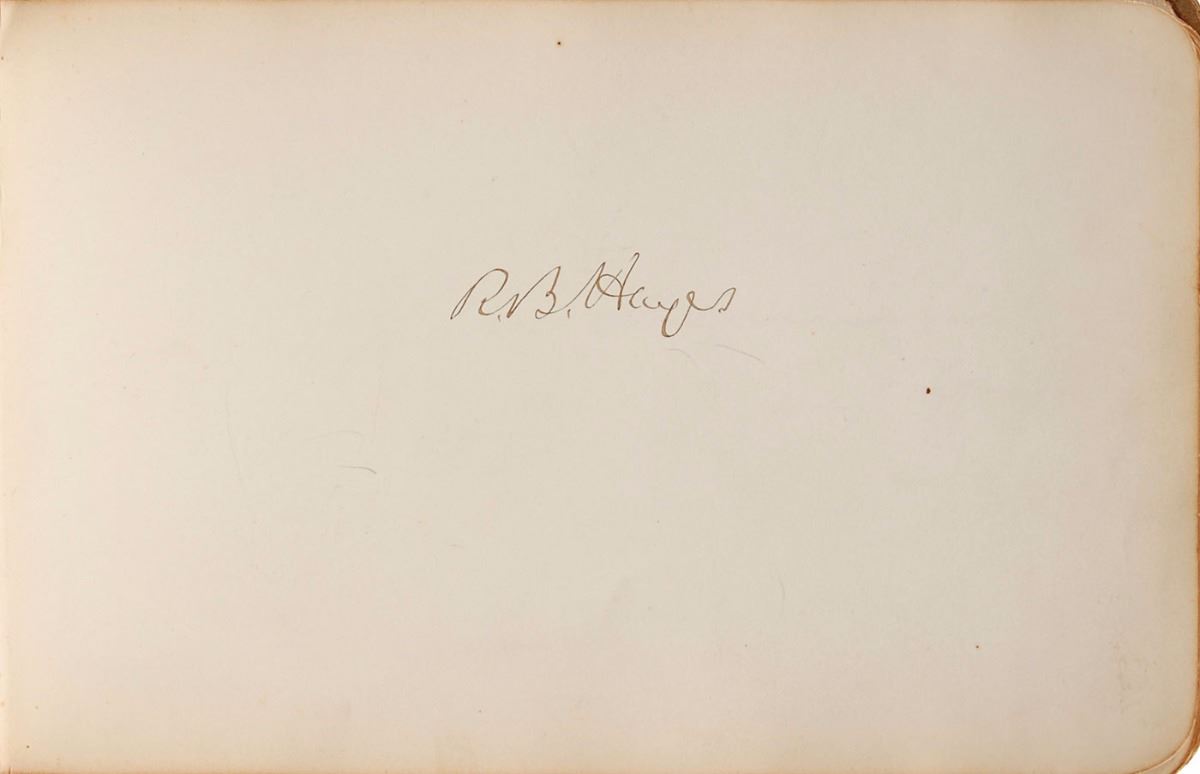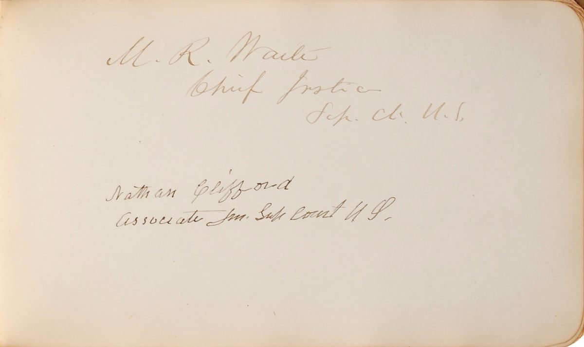 Comprehensive circa 1878 leatherbound autograph album, 7.75 x 5, signed throughout in ink by over eighty political figures (none back-to-back), focused on the executive branch, Supreme Court, and Senate, including: President Rutherford B. Hayes; Vice President William A. Wheeler; Secretary of the Treasury John Sherman; Supreme Court Justices Morrison R. Waite, Nathan Clifford, Noah Haynes Swayne, Samuel F. Miller, Stephen J. Field, William Strong, Joseph P. Bradley, Ward Hunt, and John M. Harlan; Senators Blanche Bruce, Lucius Q. Lamar, John T. Morgan, Augustus Garland, Thomas F. Bayard, David Davis, Hannibal Hamlin, James G. Blaine, William Pinkney Whyte, Roscoe Conkling, Ambrose Burnside, Matthew Butler, Samuel B. Maxey, and many others. In very good to fine condition, with the album’s covers exhibiting wear, and spine is damaged and partially separated; interior pages are in fine condition and remain bound and intact.