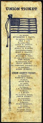 Rutherford B. Hayes for Governor. Small broadside, Union Ticket, 3 x 8, listing Hayes at top of political lineup, followed by eighteen candidates for lesser offices in Ohio. Hayes was elected and served 1868- 72 as Governor; his term as President followed. Flag shown at top. Listed on this ticket for office of State Senator is Homer Everett, whose diary/journal for the Civil War years is also offered in this catalogue, Lot 102. Blue on white. Light foxing near margin. Rare.