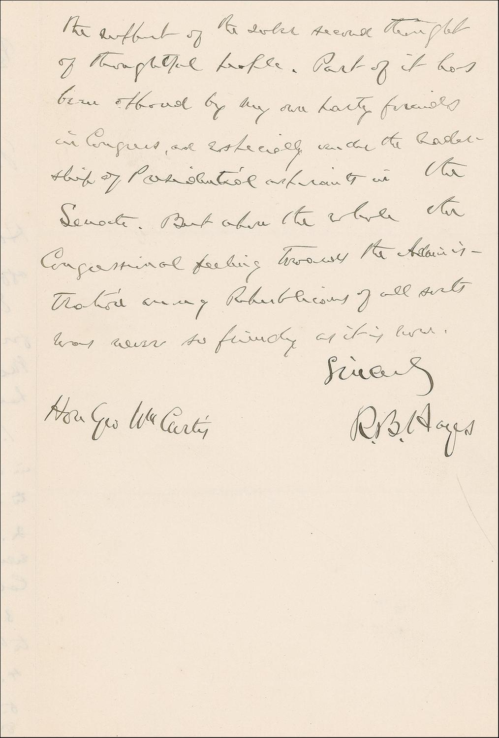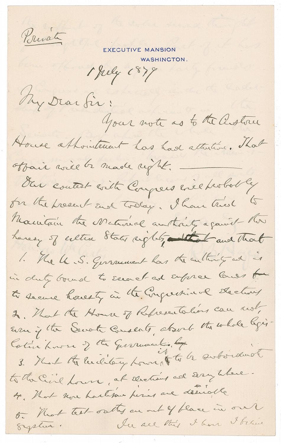 ALS as president signed “R. B. Hayes,” two pages, 5.5 x 9, Executive Mansion letterhead, July 1, 1879. Letter, headed at the top “Private,” to George W. Curtis, the political editor of Harper’s Weekly. In full: “Your note as to the Custom House appointment has had attention. That affair will be made right. Our contest with Congress will probably for the present end today. I have tried to maintain the National authority against the heresy of ultra States rights, and that 1. the U.S Government has the authority and is in duty bound to enact and enforce laws to secure honesty in the Congressional elections. 2. That the House of Representatives can not, even if the Senate consents, absorb the whole legislative power of the Government. 3. That the military power is to be subordinate to the Civil power, at elections and everywhere. 4. That non partisan juries are desirable. 5. That test-oaths are out of place in our system.