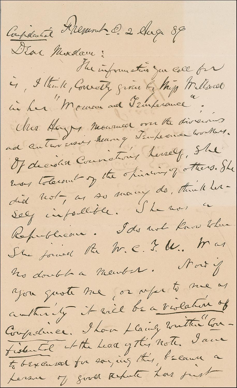 ALS, one page both sides, 4.25 x 7, August 2, 1889. A month after the death of his wife, Hayes writes a confidential letter to an unidentified woman. In full: “The information you call for is, I think, correctly given by Miss Willard in her ‘Women and Temperance.’ Mrs. Hayes mourned over the divisions and controversies among Temperance workers. Of decided convictions herself, she was tolerant of the opinions of others. She did not, as so many do, think herself infallible. She was a Republican. I do not know when she joined the W.C.T.U. [Women’s Christian Temperance Union]. Was no doubt a member. Now if you quote me, or refer to me as authority it will be a violation of confidence. I have plainly written ‘Confidential’ at the head of this note. I am to be excused for saying this, because a person of good repute has just done what ought not to have been done in this respect.” In fine condition, with two blocks of even toning on the front side, mounting remnants on the lower margin of the back page, and writing showing through from opposing sides.