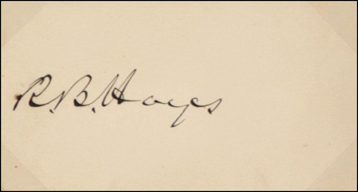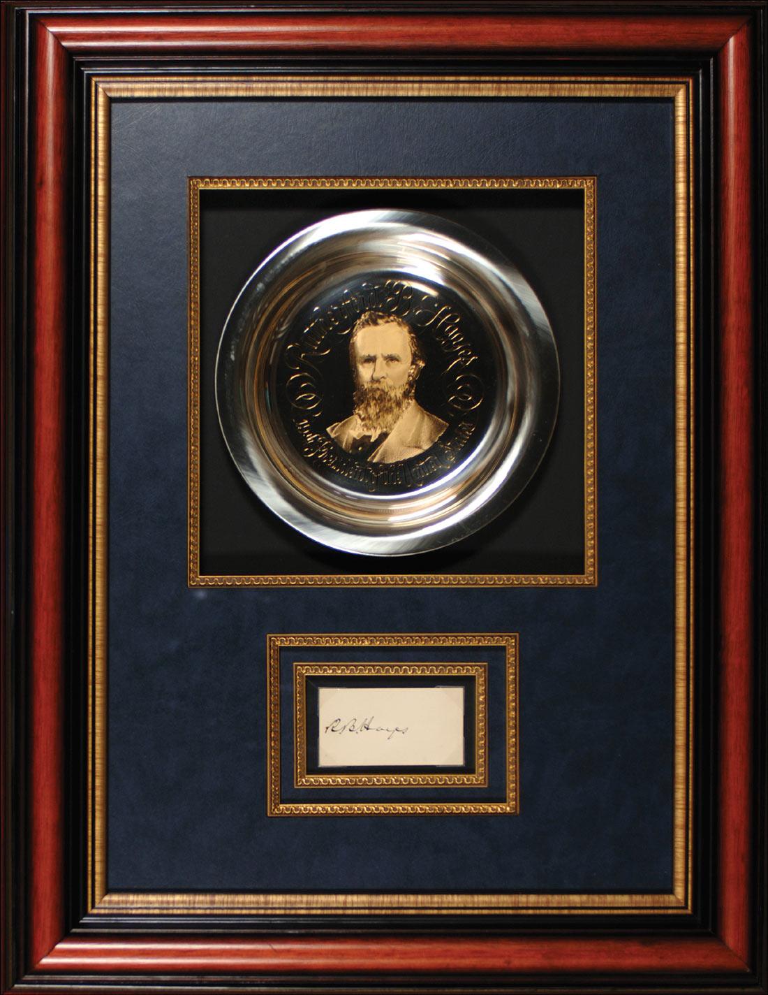 Crisp ink signature, “R. B. Hayes,” on the reverse of his off-white 3.25 x 1.75 personal calling card. Archivally shadow box framed with a gold-inlaid, sterling silver portrait plate issued in a limited edition by the Franklin Mint in the early-to-mid 1970s to an overall size of 18 x 23.5. In fine condition.