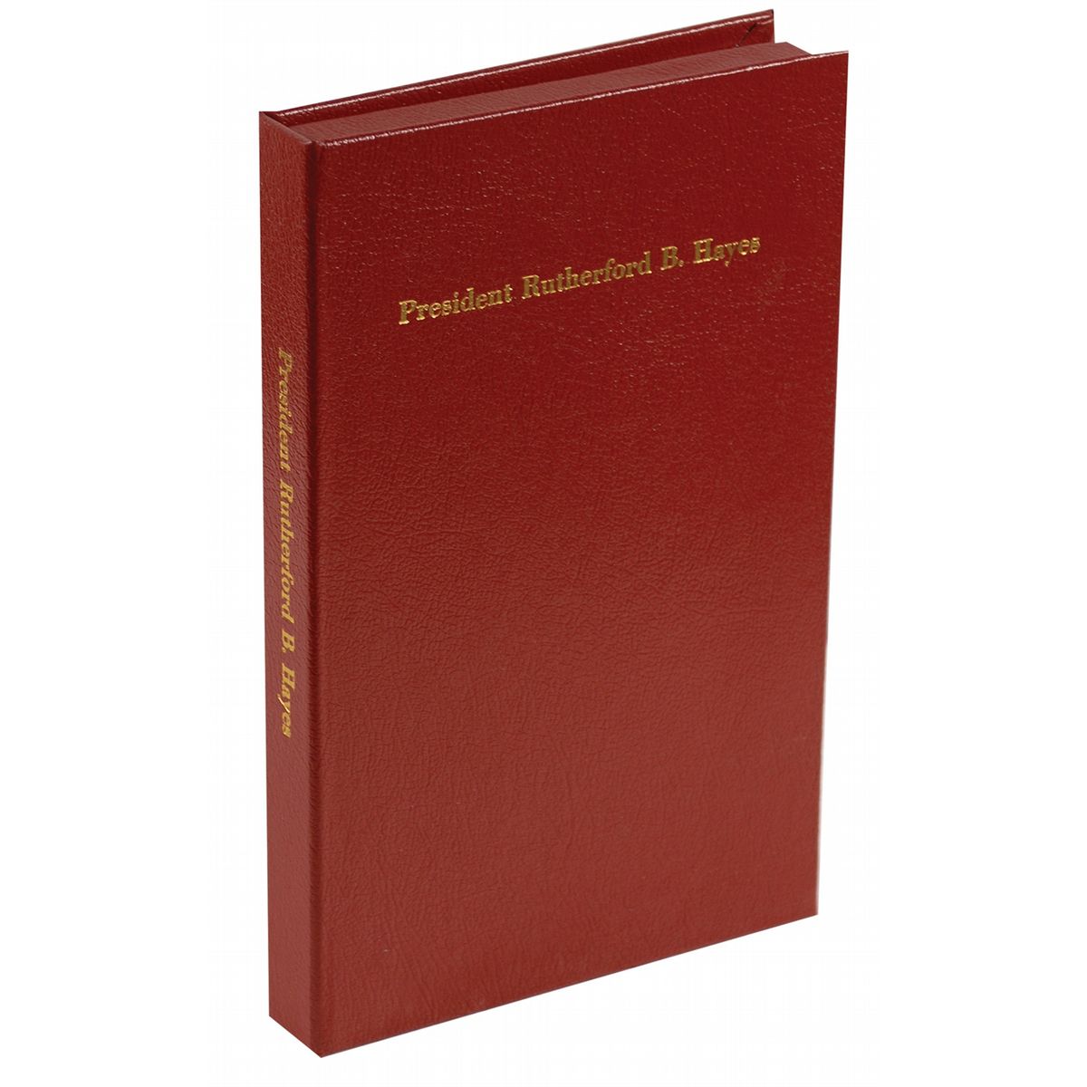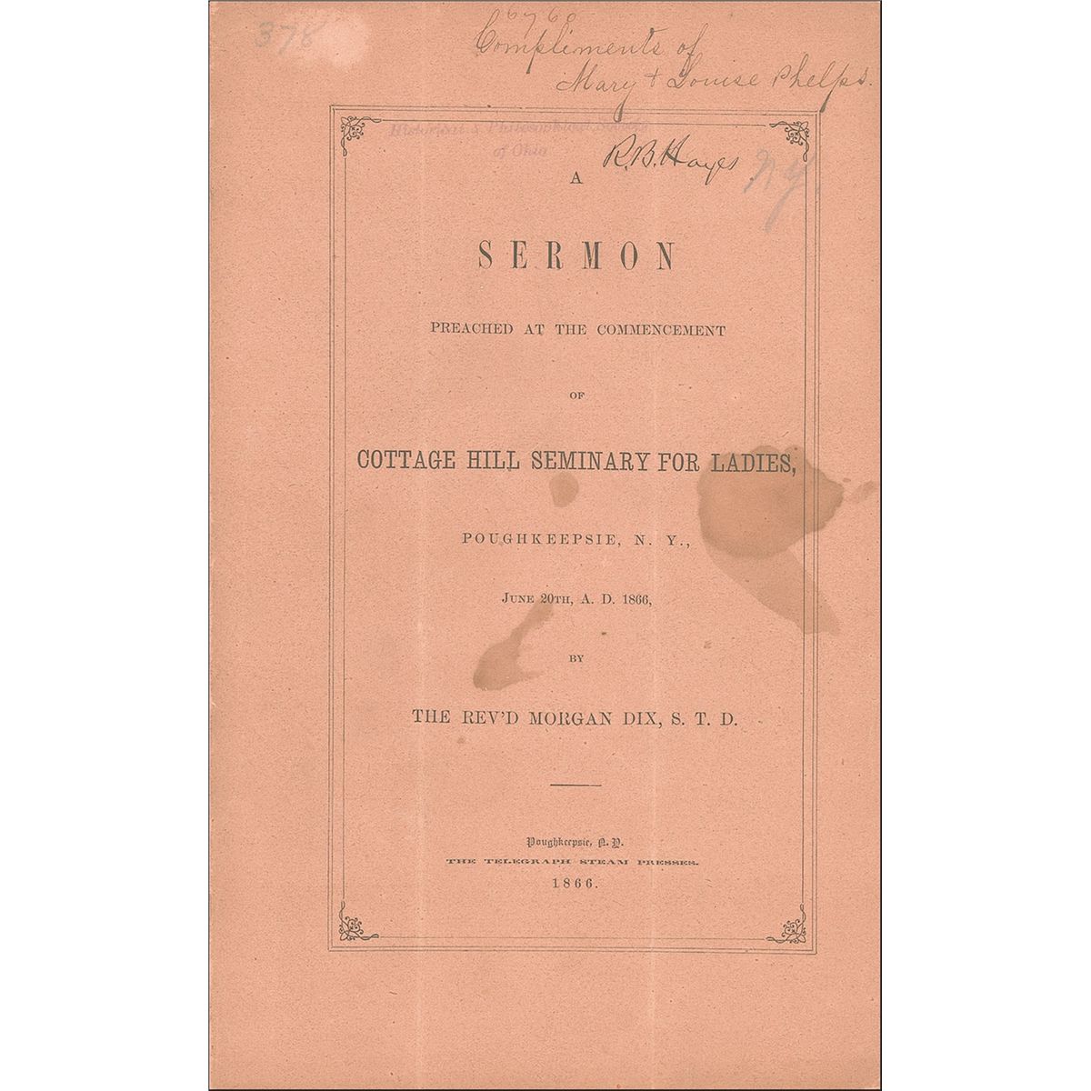 Booklet entitled A Sermon Preached at the Commencement of Cottage Hill Seminary for Ladies, Poughkeepsie, New York, June 20th, 1866 by the Rev. Morgan Dix, 5.75 x 9, 16 pages. Signed on the front cover in black ink, “R. B. Hayes.” Presentation inscription above Hayes’s signature, two vertical creases, spotting to cover extending into opening pages, inside pages partially separated from covers, and a couple pencil notations and stamp to cover, otherwise very good condition. Booklet is housed in red leatherette book box with gold lettering.