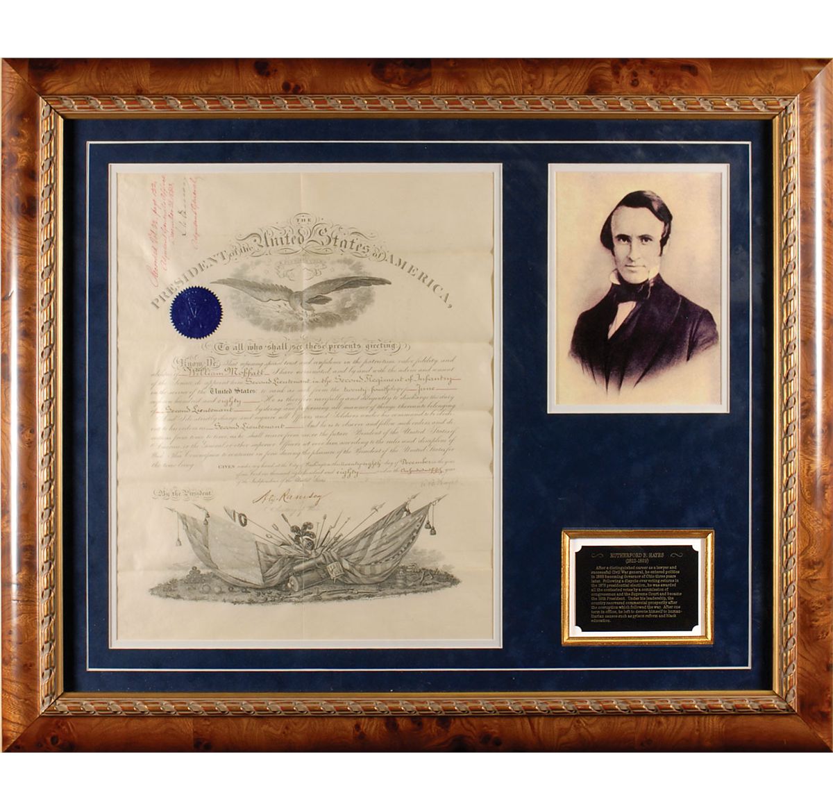 Partly-printed DS as president, signed “R. B. Hayes,” one page, 15 x 18.5, December 28, 1880. President Hayes appoints William Moffatt a “Second Lieutenant in the Second Regiment of Infantry in service of the United States.” Signed at the conclusion by Hayes, and countersigned by Secretary of War Alexander Ramsey. Double suede matted and framed with a portrait and a biographical plaque to an overall size of 34 x 28.5. In fine condition, with intersecting folds, some scattered light soiling, and Hayes’s signature a shade light, but completely legible. Oversized.