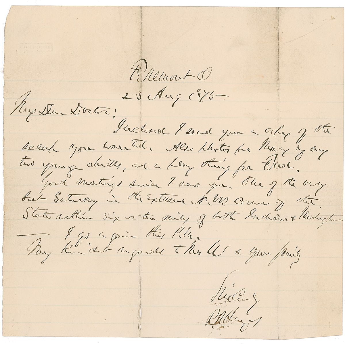ALS signed “R. B. Hayes,” one page, lightly-lined, 7.75 x 7.5, August 23, 1875. Hayes writes to his doctor. In full: “Enclosed I send you a copy of the scrap you wanted. Also photos for Mary of my two young children, and a play thing for Fred. Good meetings since I saw you. One of the very best Saturday in the extreme NW corner of the state within six or ten miles of both Indiana and Michigan—I go again this p. m. My kindest regards to Mrs. W. and your family.” In very good condition, with a single separation to intersecting folds, scattered light soiling, some light brushing to signature, and a trimmed lower edge.