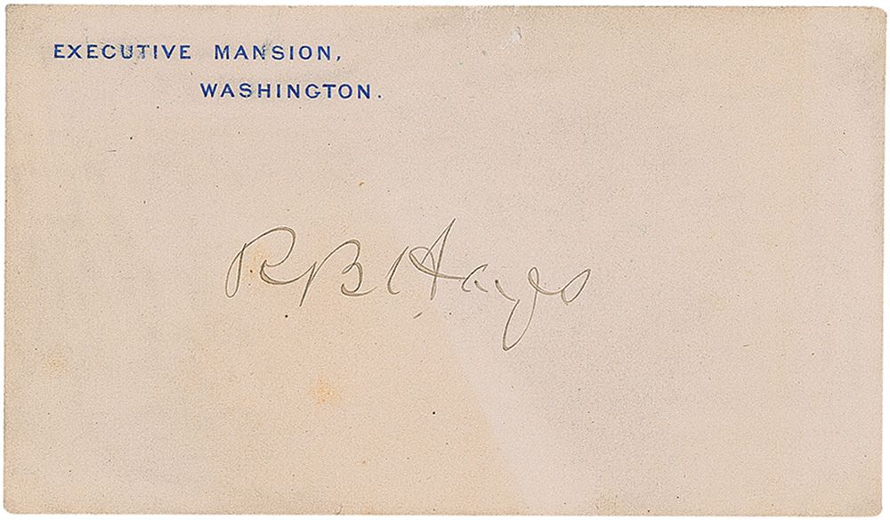 Executive Mansion card signed in black ink, “R. B. Hayes.” In very good condition, with scattered toning and light mounting remnants to reverse.