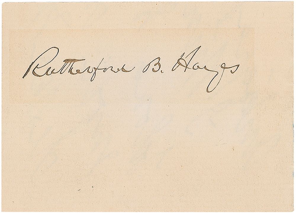 Crisp ink signature, “Rutherford B. Hayes,” on an off-white 3.25 x 2.5 slip. In fine condition, with a light block of toning over signature.