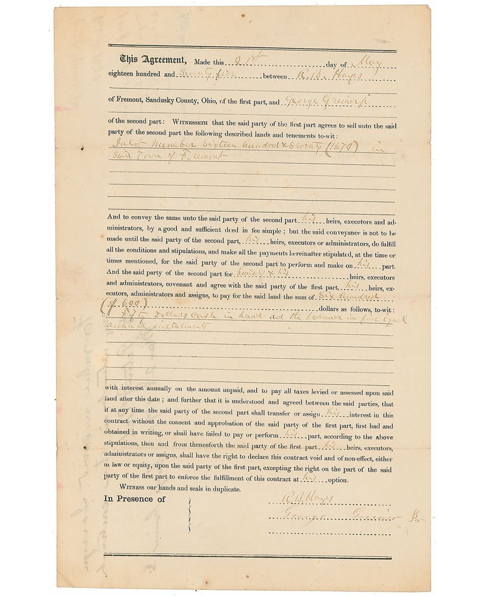 Partly-printed DS, twice-signed “R. B. Hayes,” one page, 8.5 x 13, May 21, 1875. Agreement between Hayes and George Greiner, Jr., filled out entirely in Hayes’s hand, in which he agrees to sell Greiner lot “number sixteen hundred & seventy (1670) in said