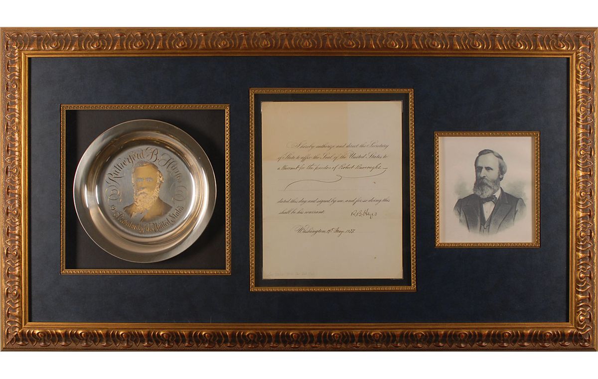 Partly-printed DS as president, signed “R. B. Hayes,” one page, 7.5 x 10, May 19, 1877. Hayes orders the secretary of state “to affix the Seal of the United States to a Warrant for the pardon of Robert Burroughs.” Nicely matted and framed with a portrait of Hayes and a gold-inlaid, sterling silver portrait plate issued in a limited edition by the Franklin Mint in the early-to-mid 1970s and a well-done copy of the front of the letter to an overall size of 33.75 x 18.5. A block of toning to top left and a pencil notation along bottom edge, otherwise fine condition. Oversized.