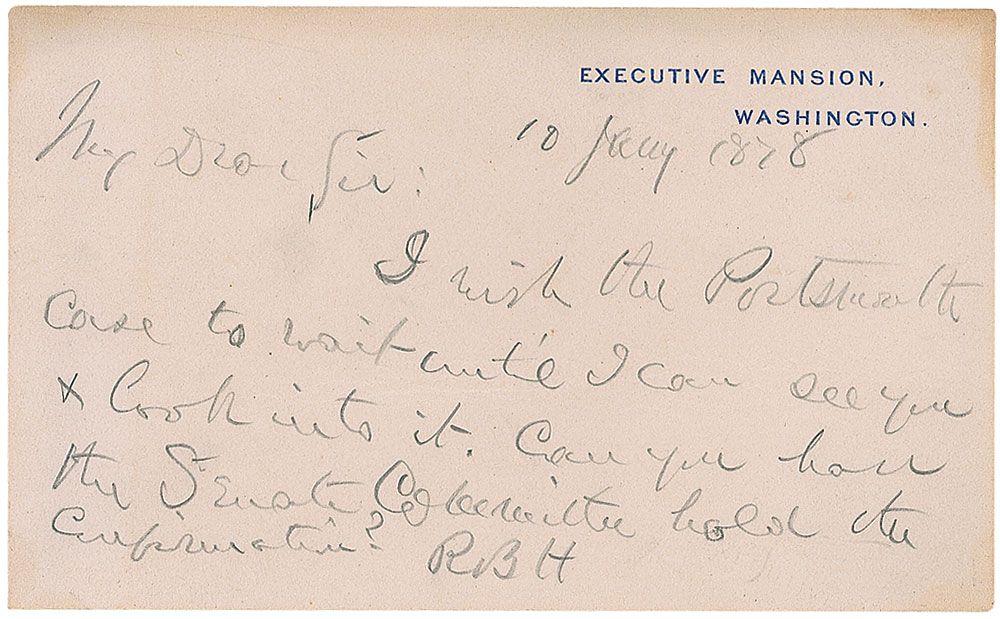 Rare Executive Mansion card bearing an ANS in pencil, signed “R. B. H.,” January 10, 1878. In full: “I wish the Portsmouth case to wait until I can see you & look into it. Can you have the Senate Committee hold the confirmation?” A collector’s notation to the reverse indicates that the message was to his postmaster general, James Noble Tyner. In fine condition, with a small crease to the center and some toning to the upper corner tips. It is quite unusual to find a note on a White House or Executive Mansion card.