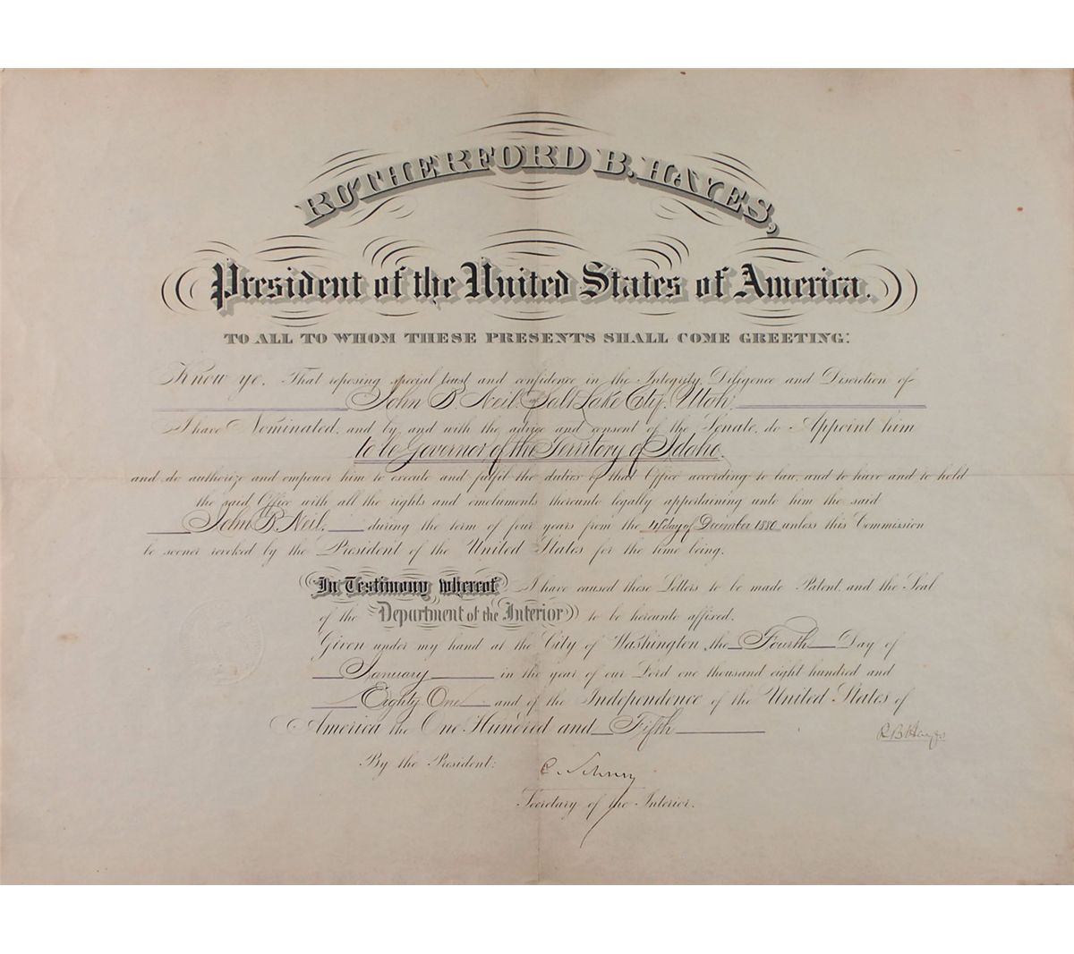 Partly-printed DS as president, signed “R. B. Hayes,” one page, 21 x 15.75, January 4, 1881. Hayes appoints John B. Neil “to be the Governor of the Territory of Idaho.” Signed at the conclusion by Hayes and countersigned by Secretary of the Interior Carl Schurz. Central horizontal and vertical folds and a bit of scattered light soiling, otherwise fine condition. Neil was a close ally of Hayes, as both sought to deal with the polygamy problem in the area. Neil was eventually removed by Chester A. Arthur amid unsubstantiated accusations including drunkenness and absence from office.