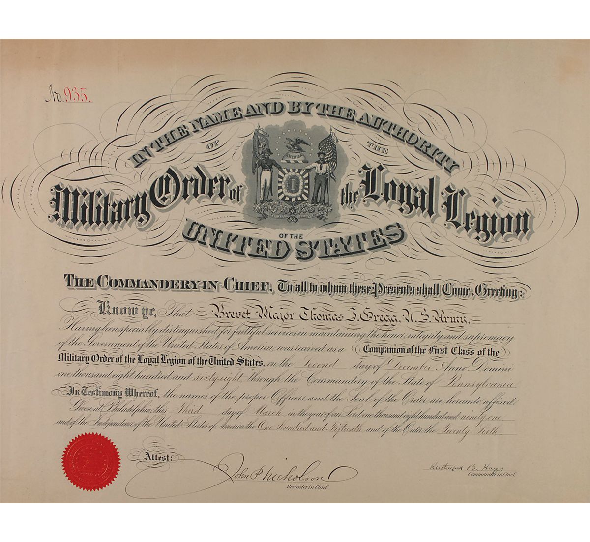 Partly-printed DS one page, 21 x 16.25, March 3, 1891. Document appointing Thomas I. Gregg of the US Army, “a companion of the First Class of the Military Order of the Loyal Legion of the United States.” Signed at the conclusion by Hates as the legion’s commander-in-chief. A slightly trimmed right edge and a strip of light toning along top edge, otherwise fine condition. The red seal is crisp and intact. This patriotic order, organized April 15, 1865, by officers of the Army, Navy, or Marine Corps of the United States who ‘had aided in maintaining the honor, integrity, and supremacy of the national movement during the American Civil War.’