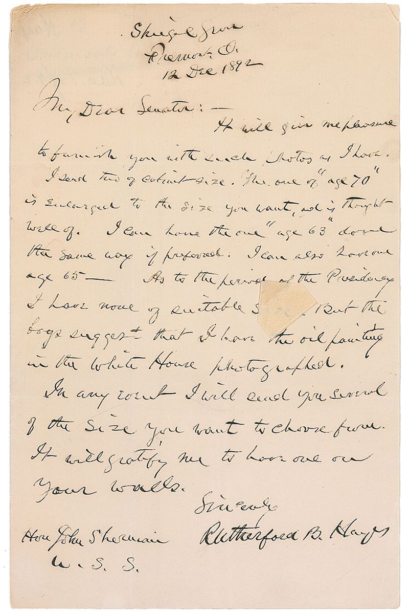 ALS, one page, 5.25 x 8.5, December 12, 1892. Letter to US Senator John Sherman. In full: “It will give me great pleasure to furnish you with such photos as I have. I send two of the cabinet size. The one of ‘age 70’ is enlarged to the size you want, and is thought well of. I can have the one ‘age 63’ done the same way if preferred. I can also have one age 65. As to the period of the Presidency I have none of suitable size. But the boys suggest that I have the oil painting in the White House photographed. In any event I will send you several of the size you want to choose from. It will gratify me to have one on your walls.” In fine condition, with intersecting folds and a small translucent corner tab affixed to center of the letter, obscuring just part of one word of text. Sherman served as Hayes’s Secretary of the Treasury during his entire administration, and obviously held him in high regard, as suggested by Hayes sending several photos.