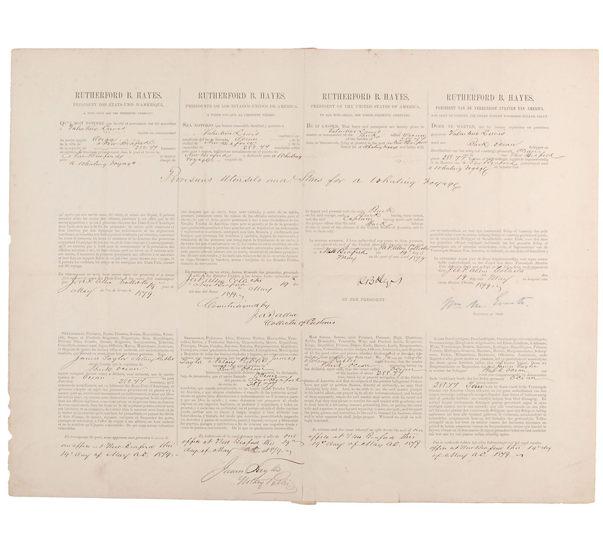 Partly-printed DS as president, signed “R. B. Hayes,” one page, 22 x 17, May 19, 1879. Four-language ship’s papers issued to “Valentine Lewis master or commander of the Bark called Ocean…lying at present in the port of New Bedford bound for a whaling voyage and laden with provisions, utensils, and stores for a whaling voyage.” Signed in the third panel by Hayes and countersigned by Secretary of State William Everts. Intersecting folds, old reinforcement to reverse of central vertical fold, a few trivial separations along folds, a uniform shade of mild toning, and some scattered light creases and edge chips, otherwise very good condition. Lewis was the captain of the Thomas Dickason, one of 33 boats trapped in Arctic ice in the Whaling Disaster of 1871. Hayes was the last president to sign ship’s papers.