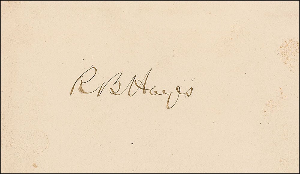 Ink signature, “R. B. Hayes,” on an off-white 4.25 x 2.5 card. Scattered light toning and soiling, a bit heavier to edges, otherwise fine condition.