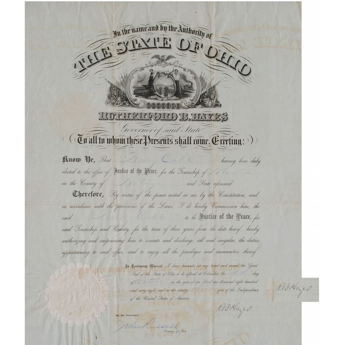 Justice of the peace document signed by Rutherford B. Hayes as governor of Ohio. Appointing Henry Cobb state of Ohio, in the township of Mantna dated, October 16th,1868.