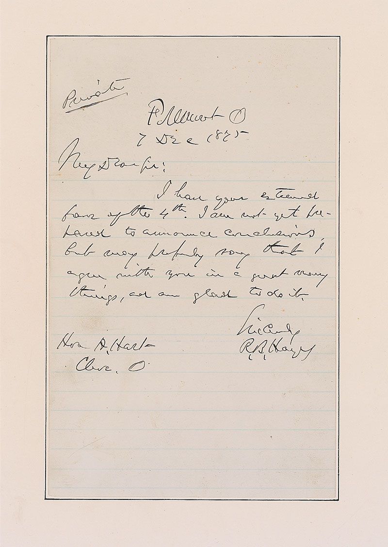ALS signed “R. B. Hayes,” one page, lightly-lined, 5 x 7.75, December 7, 1875. Letter to A. Hart of Cleveland. In part: “I am not yet prepared to announce conclusions, but may properly say that I agree with you in a great many things.” Affixed by the left edge to a slightly larger card. In fine condition.