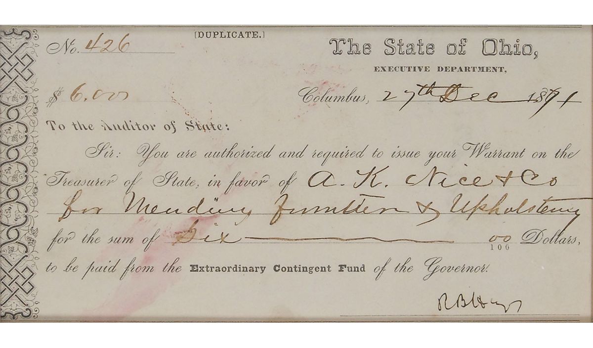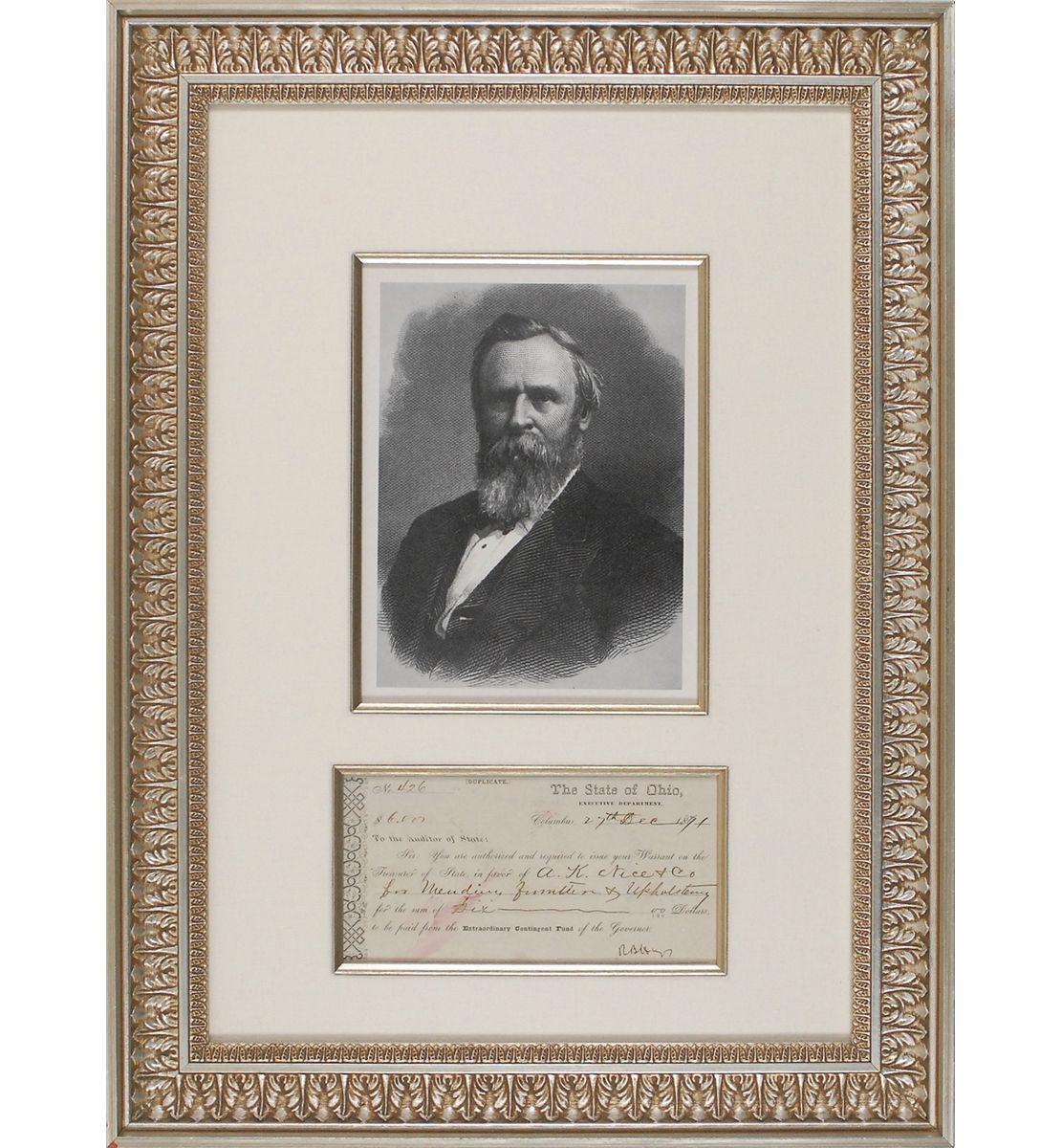 Partly-printed DS, signed as governor of Ohio, “R. B. Hayes,” one page, 7.25 x 4, December 27, 1871. State of Ohio financial document authorizing the auditor of the state “to issue your Warrant on the Treasurer of the State in favor of A. K. Nice & Co. for mending furniture & upholstery for the sum of six—00 dollars.” Signed at the conclusion by Hayes. Archivally cloth-matted and framed with an engraved portrait of Hayes to an overall size of 16.5 x 22. In very good condition, with a few fingerprints to written portions of document, some red staining to lower left, and show-through from stamp on reverse.