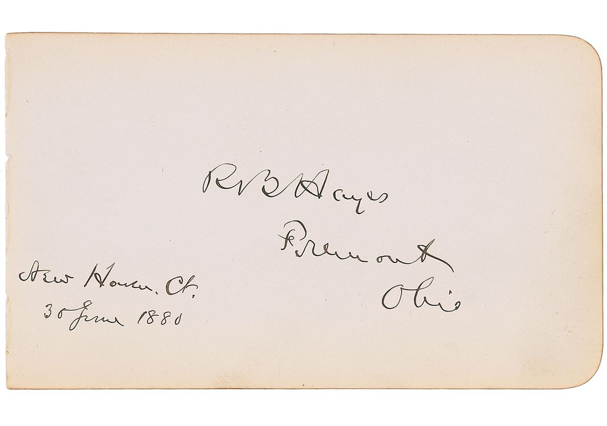 Bold ink signature as president, “R. B. Hayes, Fremont, Ohio. New Haven, Ct. 30 June 1880,” on an off-white 6.75 x 4 album page. In fine condition, with toning to edges.