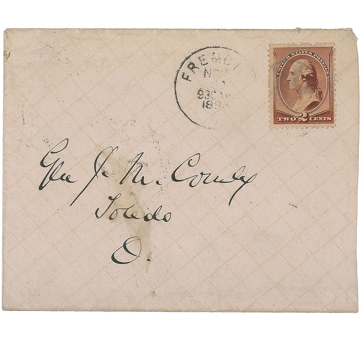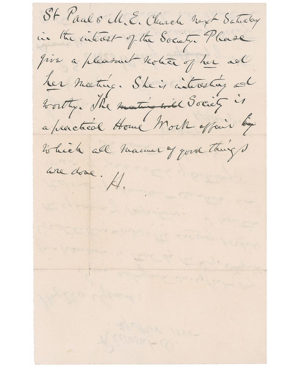 ALS signed “R. B. Hayes,” one page both sides, 5.5 x 8.5, November 29, 1885. Letter to a general. In part: “I am not quite sure, but my impression is that by the Loyal legion Constitution & rules of secrecy forbids the exposure of rejections. I mention this out of abundant caution in view of your article of Saturday.” Hayes also adds a brief postscript under his signature regarding the Woman Home Missionary Society and an upcoming talk at St. Paul’s Church. In fine condition, with intersecting folds and some light mirroring of ink. Accompanied by the original mailing envelope.