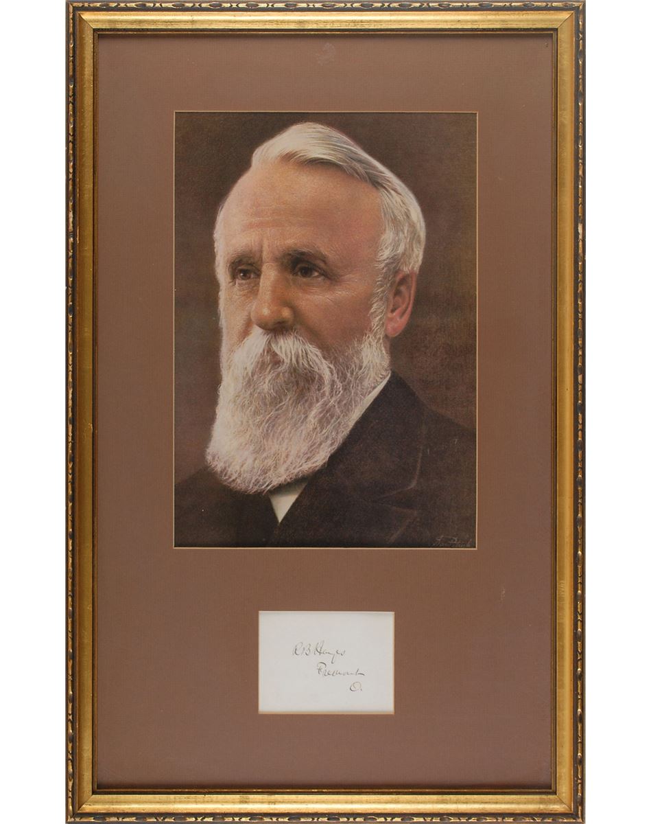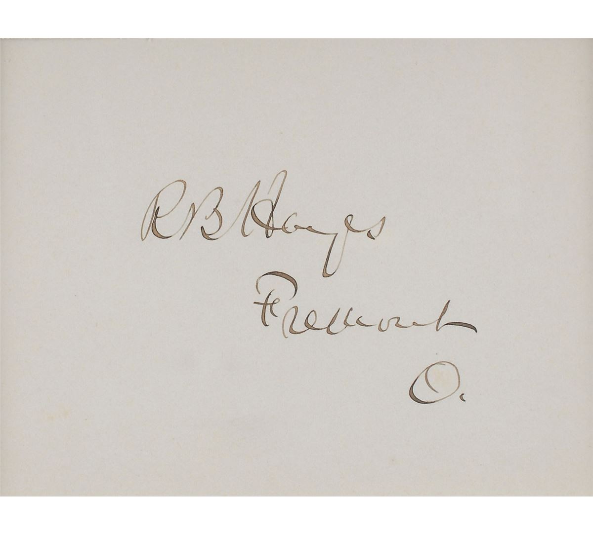 Ink signature, “R. B. Hayes, Fremont, O.,” on a white 4 x 3 sheet. Matted and framed with an artistic depiction of Hayes to an overall size of 15.5 x 24.5. In fine condition.