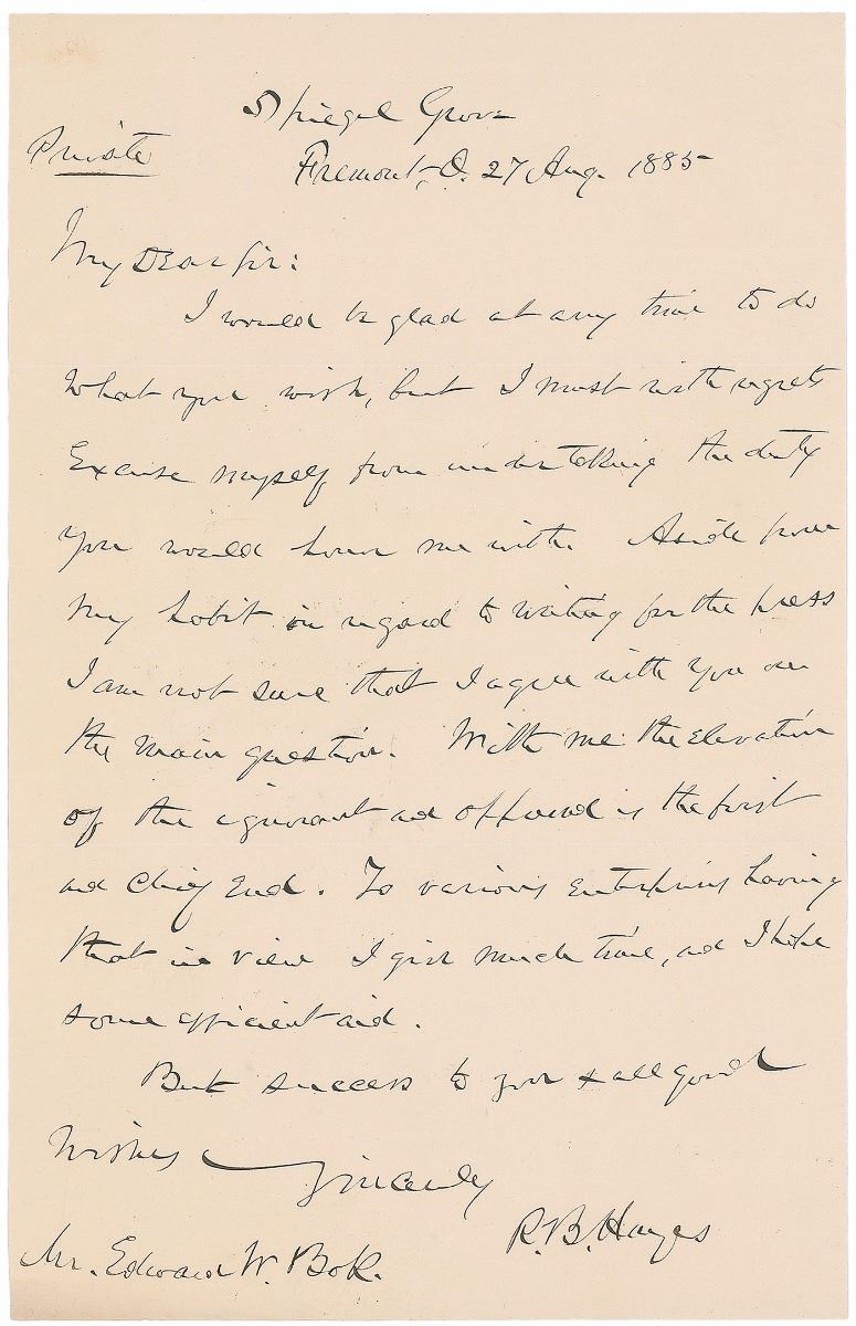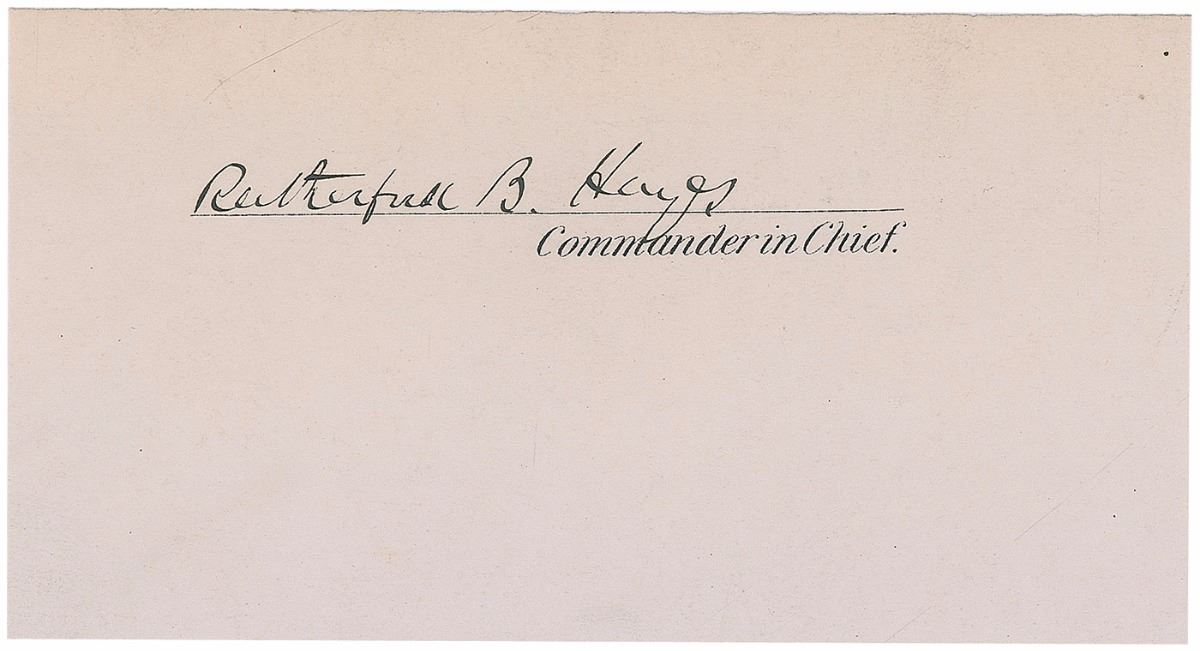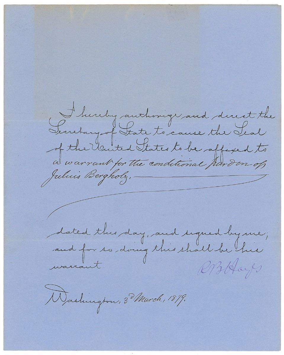 Three items: a DS as president, signed “R. B. Hayes,” one page, 8 x 10, March 3, 1879, authorizing “the conditional pardon of Julius Bergholz”; an ALS signed “R. B. Hayes,” one page, 5.5 x 8.5, August 27, 1885, declining a proposal “in regard to writing for the press”; and a bold full ink signature, “Rutherford B. Hayes,” on an off-white 5.5 x 2.75 slip. In overall fine condition, with a block of toning to the top of the pardon document.