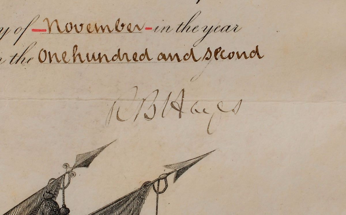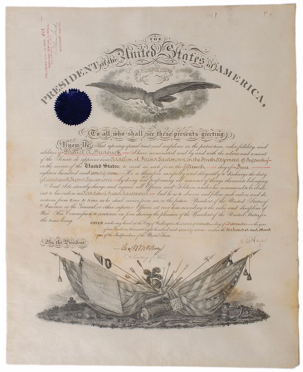 Partly-printed vellum DS as president, signed “R. B. Hayes,” one page, 15.75 x 19.25, November 27, 1877. President Hayes appoints Daniel A. Frederick as “Additional Second Lieutenant in the Tenth Regiment of Infantry in the service of the United States.” Signed at the conclusion by President Hayes and countersigned by Secretary of War George W. McCrary. Slight wear to the intact blue seal affixed to the upper left. In fine condition, with intersecting storage folds (one horizontal fold passing through the first three letters of the signature), slight scattered soiling, and a few holes along top edge.