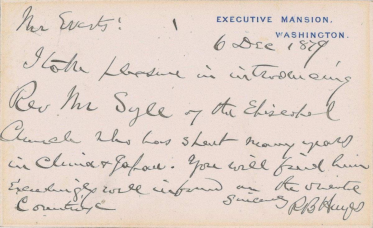 ANS signed “R. B. Hayes,” one page, 4.5 x 2.75, Executive Mansion card, December 6, 1879. Note to Mr. Everts, in full: “I take pleasure in introducing Rev. Mr. Syle of the Episcopal Church who has spent many years in China & Japan. You will find him exceedingly well-informed on the oriental countries.” Reverse bears collector’s ink notations. In fine condition, with toning to edges.
