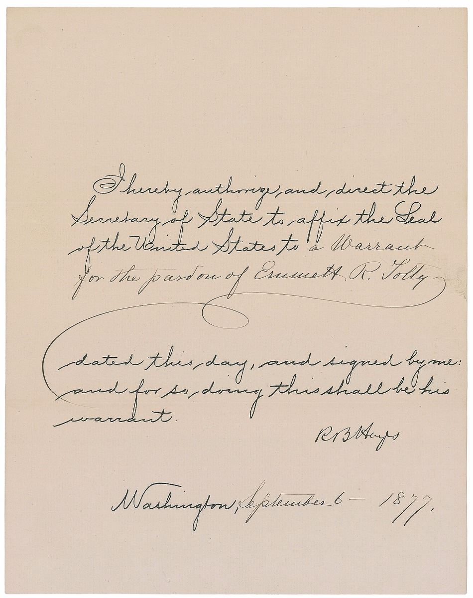 Partly-printed DS as president, signed “R. B. Hayes,” one page, 7.75 x 10, September 6, 1877. President Hayes directs the “Secretary of State to affix the Seal of the United States to a Warrant for the pardon of Emmett R. Tolty.” Boldly signed at the conclusion by President Hayes. In fine condition, with trivial soiling to the right edge.