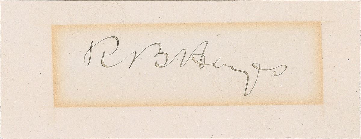 Ink signature, “R. B. Hayes,” on an off-white 3.75 x 1.5 clipped card. In fine condition, with a block of light toning from prior display. Accompanied by an engraved portrait of the nineteenth president.