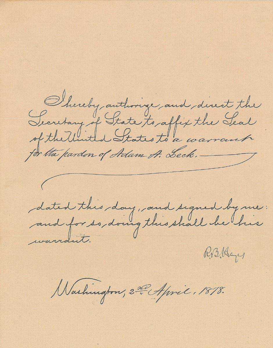 Partly-printed DS, signed “R. B. Hayes,” one page, 7.75 x 9.75, April 2, 1878. President Hayes authorizes the Secretary of State to affix the Seal of the United States to “a warrant for the pardon of Adam A. Leck.” Signed at the conclusion by Hayes. In fine condition. Ex. Charles Hamilton, October 2, 1995; sale 91, lot 231.