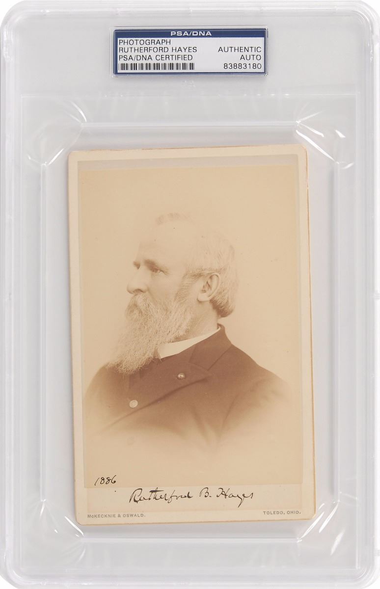Wonderful 4.25 x 6.5 cabinet photo of Hayes in near profile, signed on the mount in black ink, “Rutherford B. Hayes,” and dated 1886. Published by McKecknie & Oswald of Toledo. Encapsulated in a plastic PSA/DNA authentication holder. In fine condition, with a mounting remnant to the reverse.