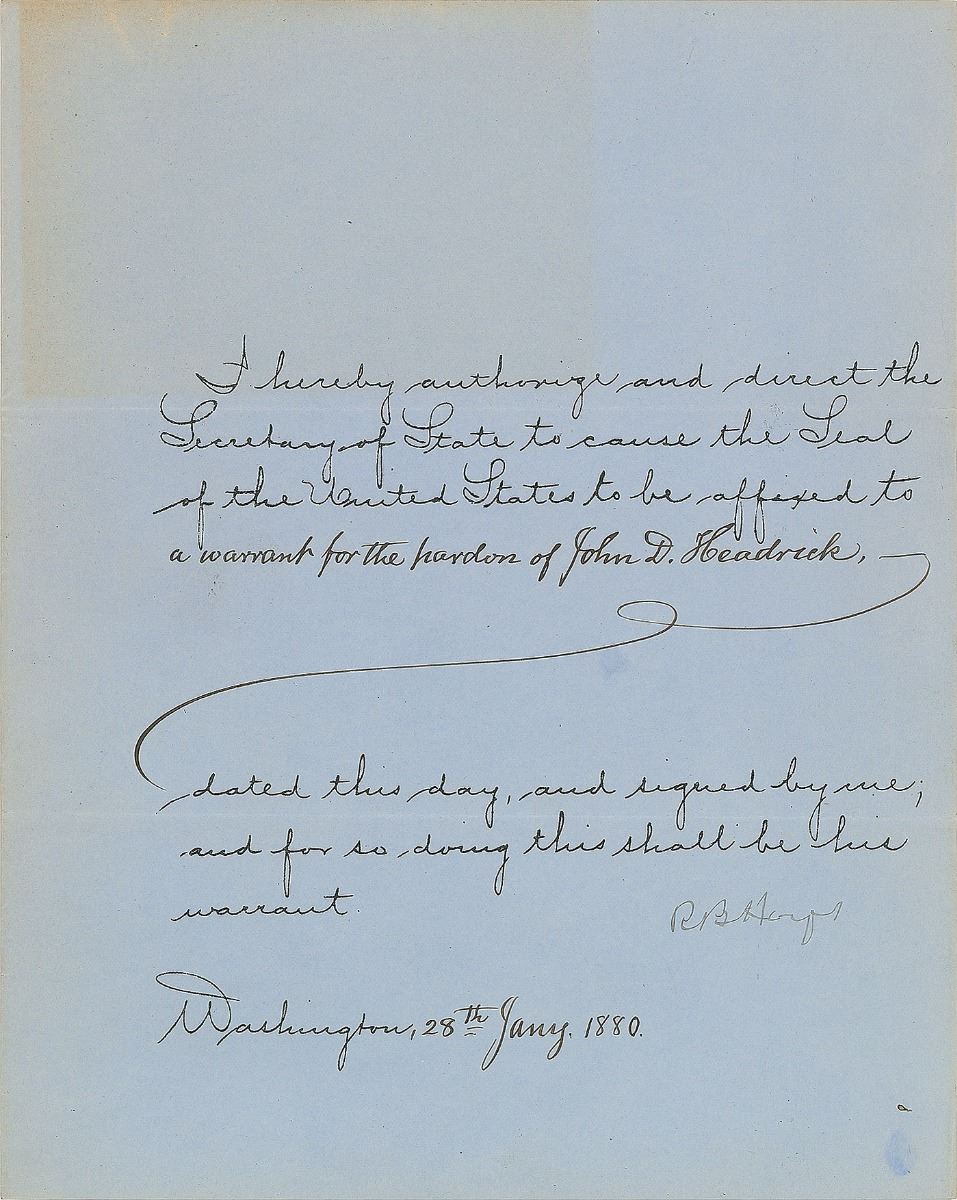 Partly-printed DS, signed “R. B. Hayes,” one page, 8 x 10, January 28, 1880. President Hayes authorizes and directs the “Secretary of State to cause the Seal of the United States to be affixed to a warrant for the pardon of John D. Headrick.” In fine condition, with a light block toning to the upper left.