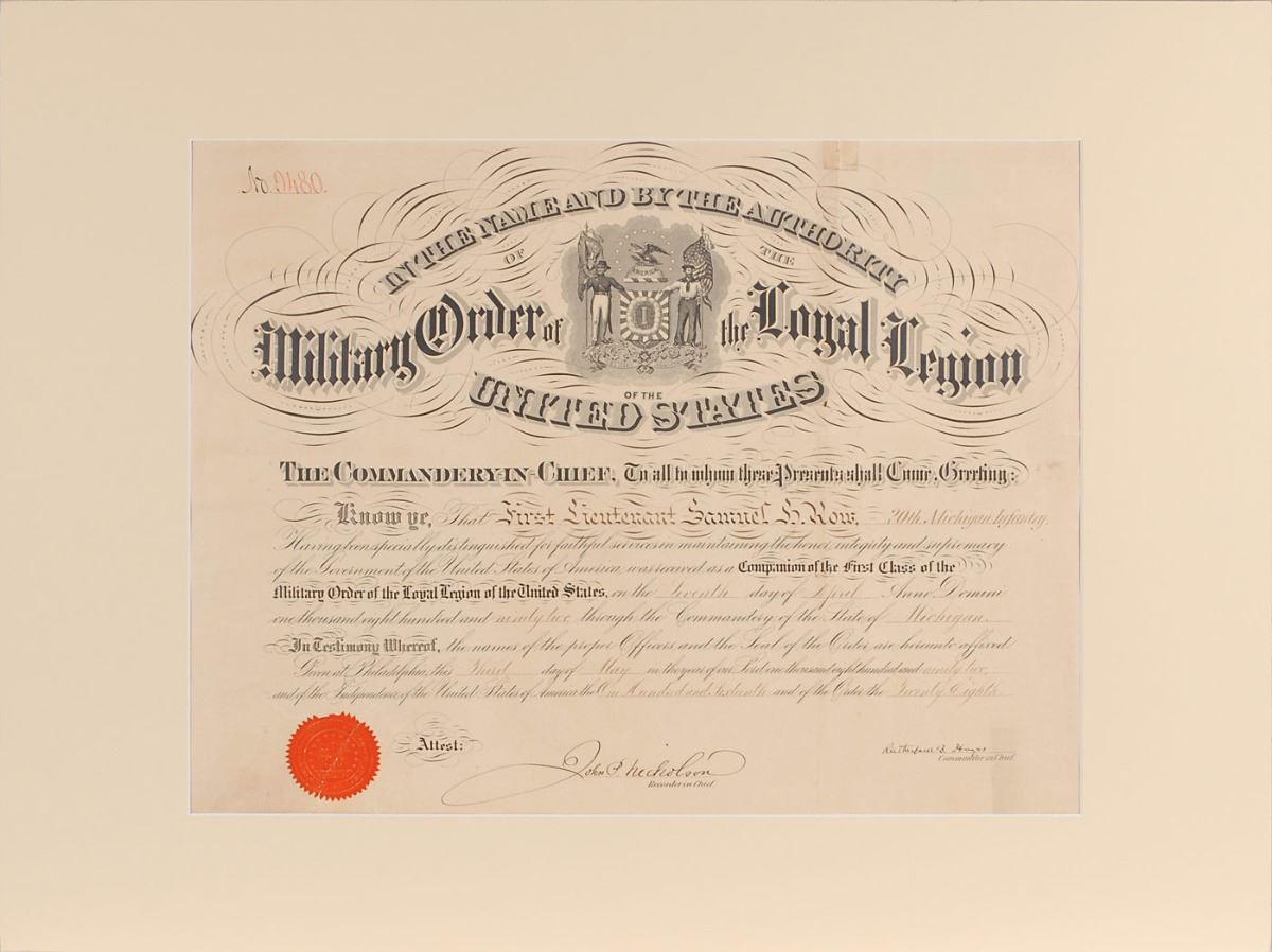 Partly-printed DS, one page, 19.5 x 15.5, May 3, 1892. Membership certificate for the Military Order of the Loyal Legion of the United States. In part: “Know ye, that First Lieutenant Samuel H. Row, 20th Michigan Infantry, Having been specially distinguished for faithful service…was received as a Companion of the First Class of the Military Order of the Loyal Legion of the United States.” Nicely signed at the conclusion by Hayes using his uncommon full signature, and countersigned by recorder John P. Nicholson. The red seal affixed to the lower left remains intact. Matted and in very good condition, with scattered overall creasing, a small fleck of paper loss, and old tape on a tear at the top edge. Accompanied by a full letter of authenticity from JSA.