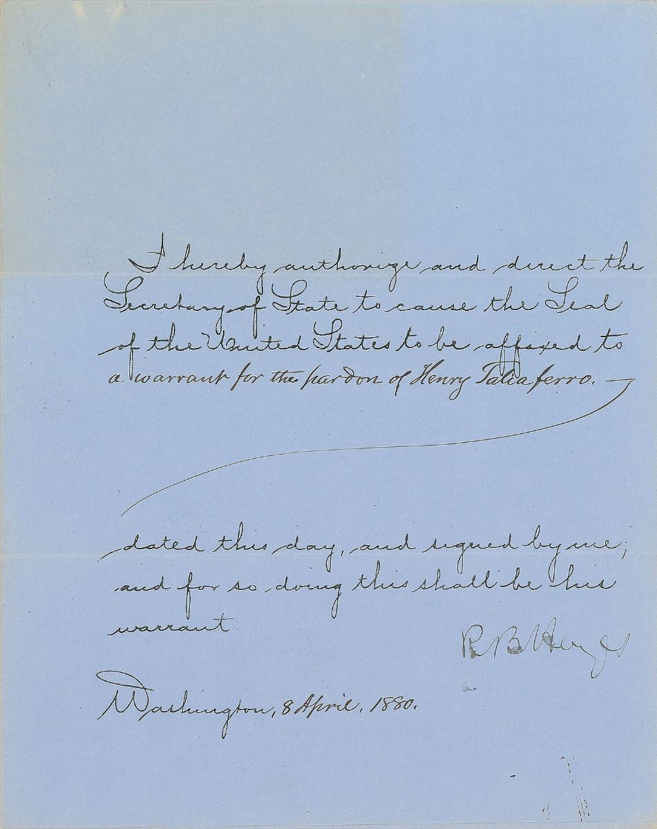 Partly-printed DS as president, signed “R. B. Hayes,” one page, 8 x 10, April 8, 1880. President Hayes authorizes and directs the “Secretary of State to cause the Seal of the United States to be affixed to a warrant for the pardon of Henry Taliaferro.” In fine condition, with a paperclip impression to the top edge.
