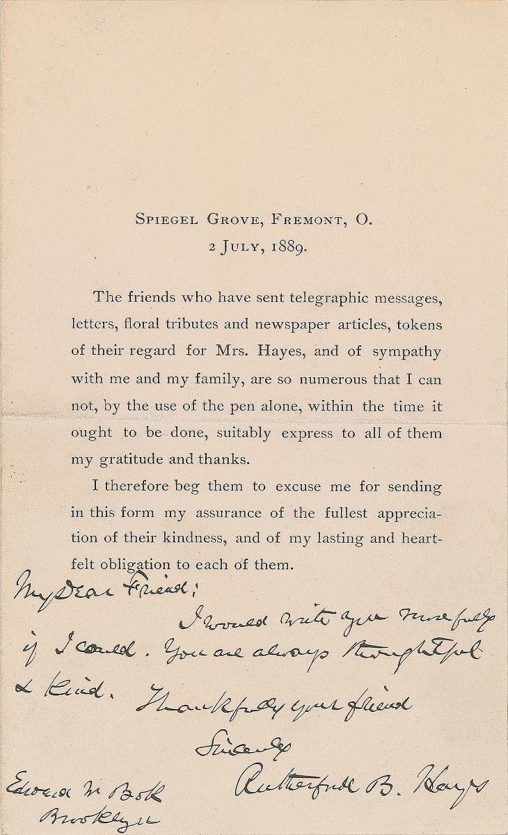 Uncommon printed sheet from Spiegel Grove, dated July 2, 1889, sent out by Hayes after his wife Lucy’s passing, 4.25 x 7, bearing an ANS in the lower portion, addressed to journalist and editor Edward Bok, in full: “I would write you more fully if I could. You are always thoughtful & kind. Thankfully, your friend, Sincerely, Rutherford B. Hayes.” In fine condition. Edward Bok was the editor of The Brooklyn Magazine, who, in May 1886, aided Hayes in publishing an article that argued for national aid to education. Following the outpouring of condolences received by Hayes, the former president had this seldom-seen sheet printed for many of his closest friends, adding handwritten sentiments to a scarce few.