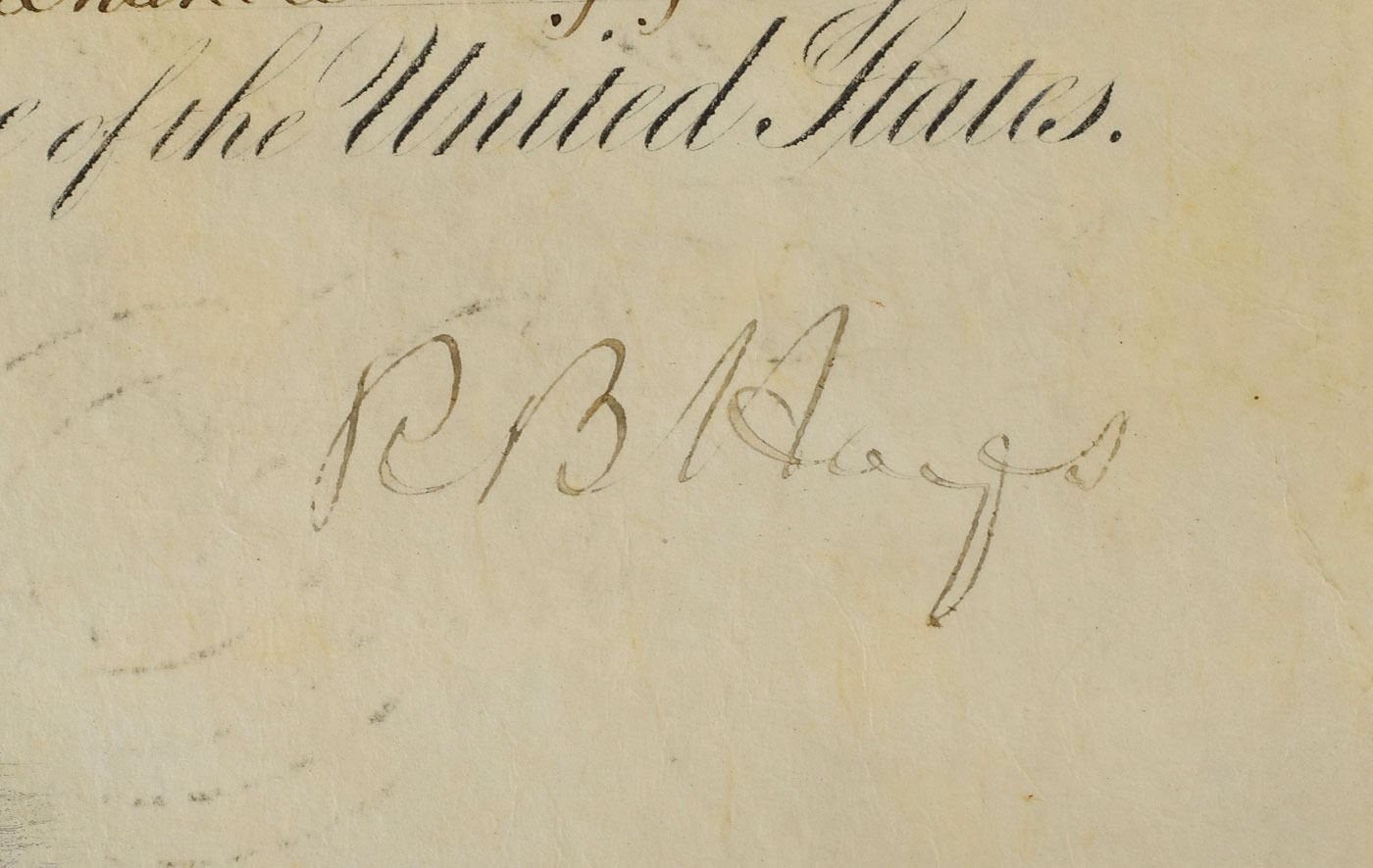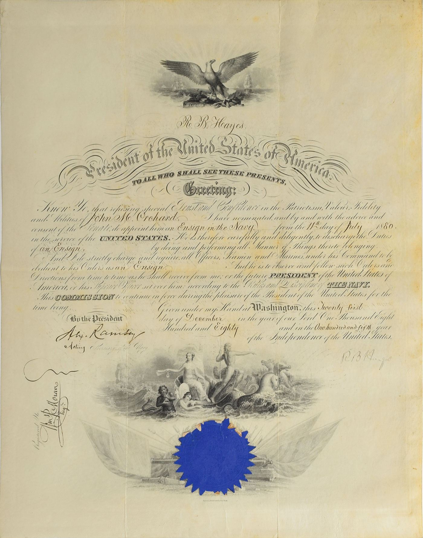 Partly-printed vellum DS as president, signed “R. B. Hayes,” one page, 15.75 x 19.5, December 21, 1880. President Hayes appoints John M. Orchard as an "Ensign in the Navy." Signed at the conclusion by Hayes, and countersigned by Acting Secretary of the Navy Alexander Ramsey. Blue Navy Department seal remains affixed to lower vignette. In very good to fine condition, with areas of light toning.