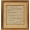 Partly-printed DS, one page, 5 x 5.25, dated 1887. Issued to the Standing Committee of the Electors, Hayes has signed and filled out a nomination form for the Board of Overseers of Harvard University, on which he lists the names of his nominations: "Theodore Lyman, James Russell Lowell, Henry P. Walcott, Francis C. Lowell, John J. Coolidge." Signed at the conclusion, "Rutherford B. Hayes, Freemont, O.," with Hayes striking through "Class of 1845 Law School" and adding "Degree 1877," the first year of his presidency. Matted, framed, and in very good to fine condition, with a bit of paper loss to the upper left corner and light toning to the perimeter.