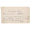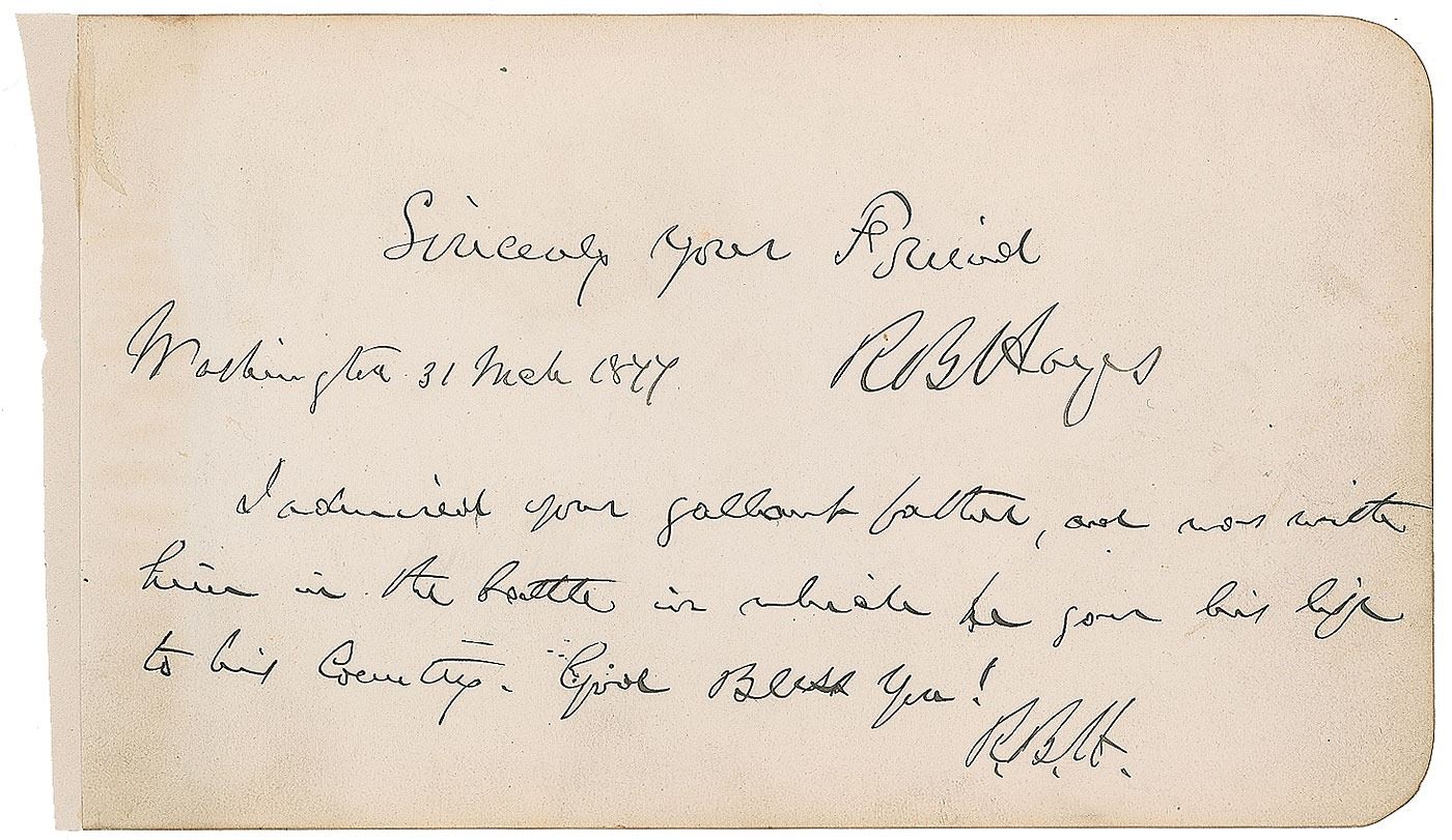 ANS as president, one page, 6.75 x 4, March 31, 1877. A warm note on an album page, in full: "Sincerely your Friend, R. B. Hayes, Washington, 31 Mch 1877. I admired your gallant father, and was with him in the battle in which he gave his life to his Country. God bless you! R. B. H." In fine condition, with light show-through from an old mounting strip on the reverse left edge.