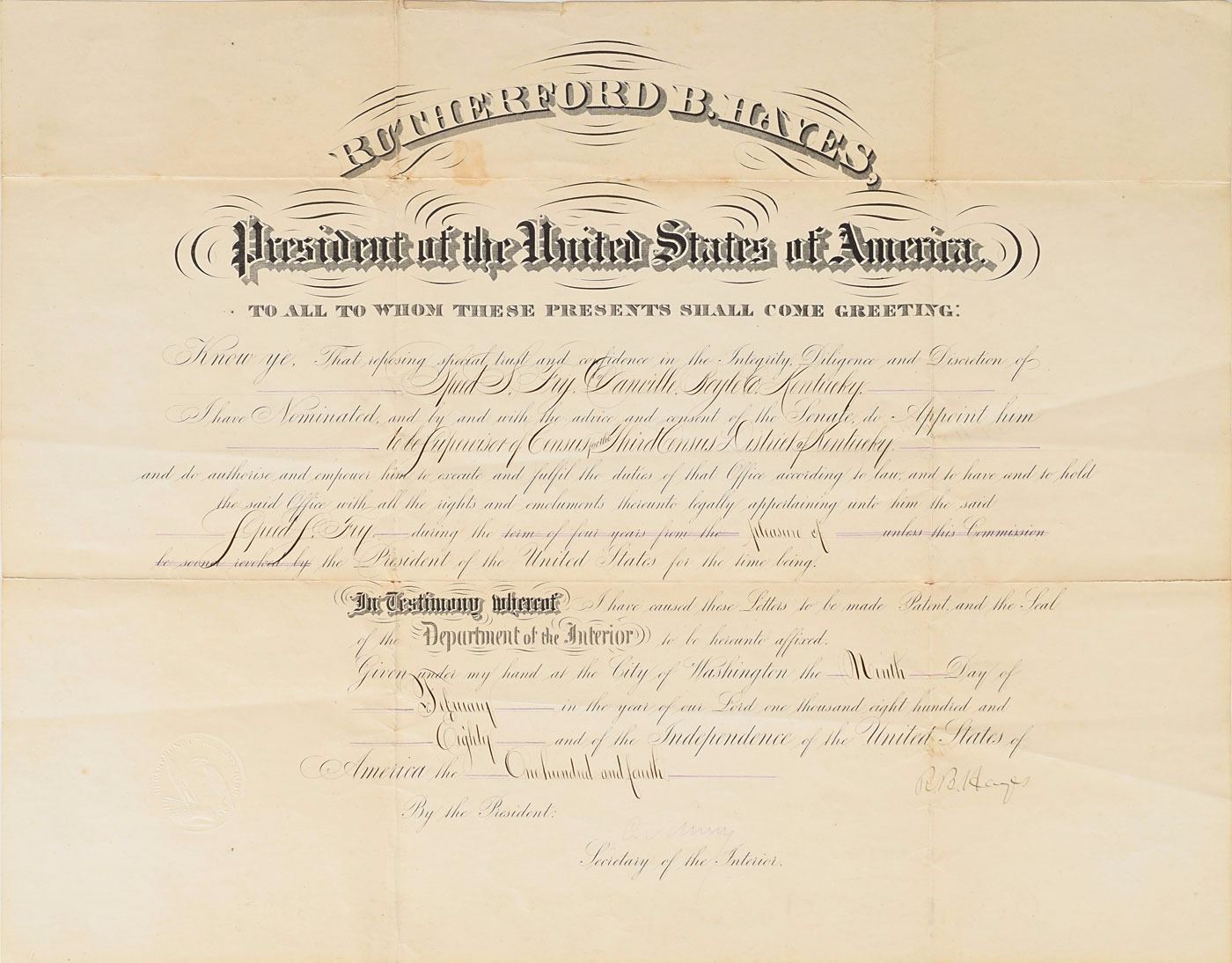 Partly-printed DS as president, signed “R. B. Hayes,” one page, 21 x 16, February 9, 1880. President Hayes appoints Speed S. Fry of Danville, Kentucky, as "Supervisor of Census for the Third Census, District of Kentucky." Signed at the conclusion by President Hayes and countersigned by Secretary of the Interior Carl Schurz. In very good to fine condition, with scattered light staining and creasing, minor paper loss at fold intersections, and a heavy fold passing through Hayes's first initial.