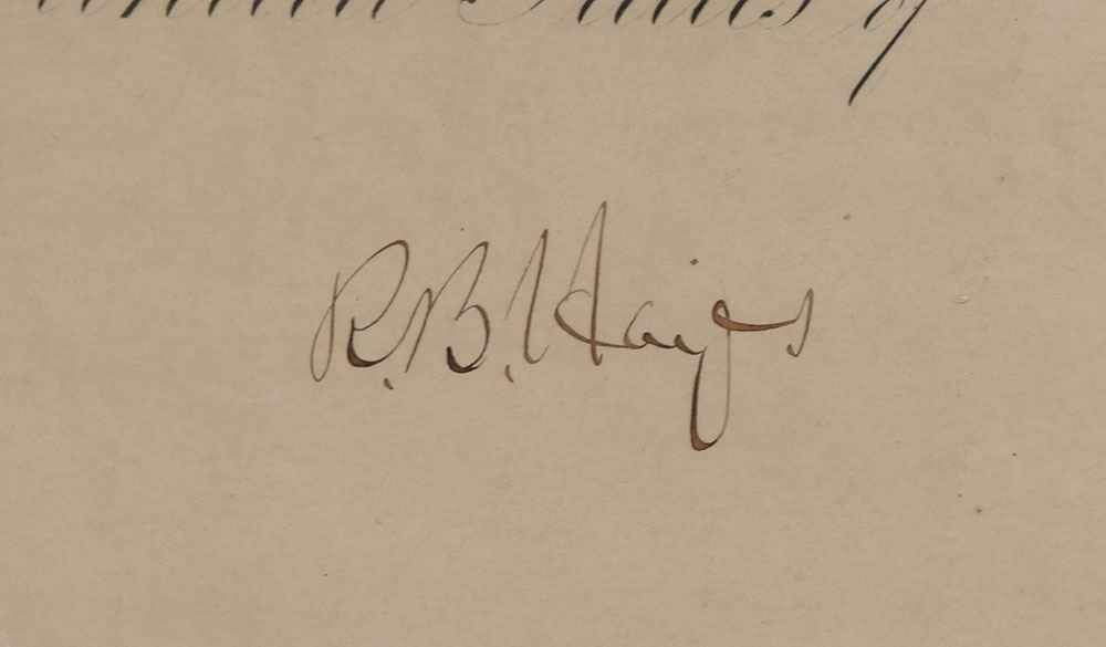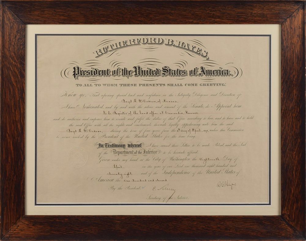 Partly-printed DS as president, signed “R. B. Hayes,” one page, 18.5 x 13.5, April 18, 1878. President Hayes appoints Boyd H. McEckron of Kansas "to be Register of the land office at Concordia, Kansas." Crisply signed at the conclusion by President Hayes and countersigned by Secretary of the Interior Carl Schurz. Double-matted and framed to an overall size of 24.5 x 19. In fine condition. Hayes documents countersigned by Schurz, who had served as a Union general in the Civil War, are quite uncommon.