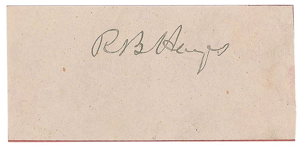 Ink signature, "R. B. Hayes,” on an off-white 2.75 x 1.25 slip. Backed by red paper and in fine condition.