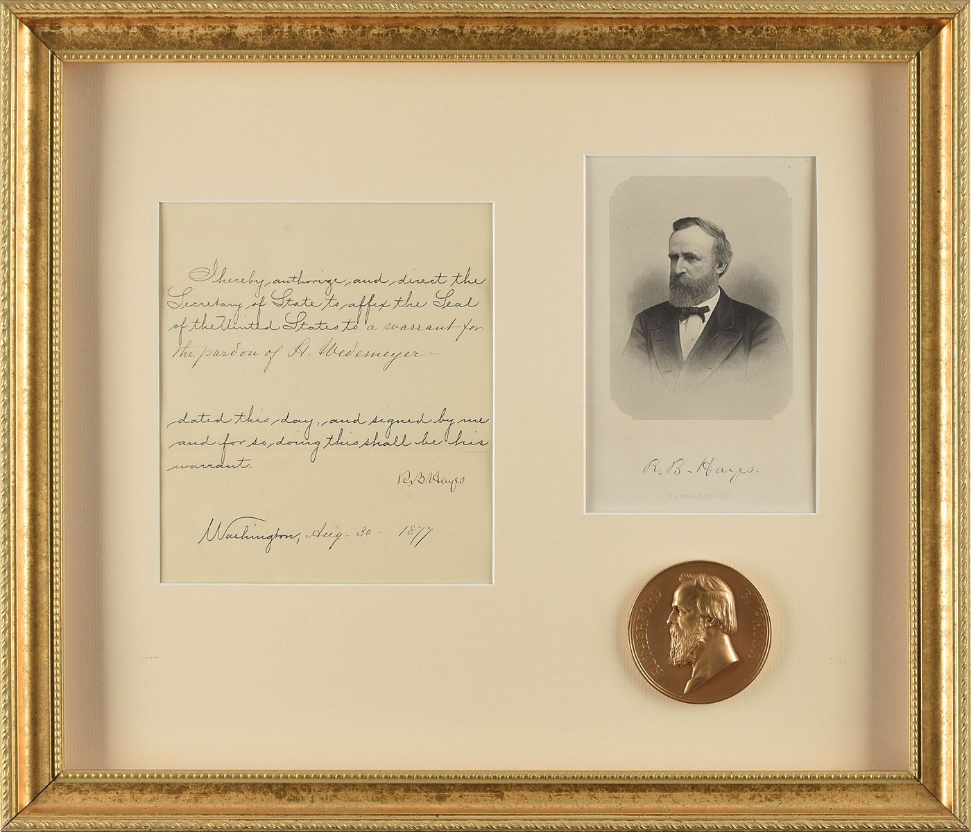 Partly-printed DS as president, signed “R. B. Hayes,” one page, 7 x 7.75, August 30, 1877. President Hayes authorizes and directs the "Secretary of State to affix the Seal of the United States to a warrant for the pardon of H. Wedemeyer." Nicely double-matted and framed with an engraved portrait (bearing a facsimile signature) and medallion to an overall size of 19.75 x 17. In fine condition.