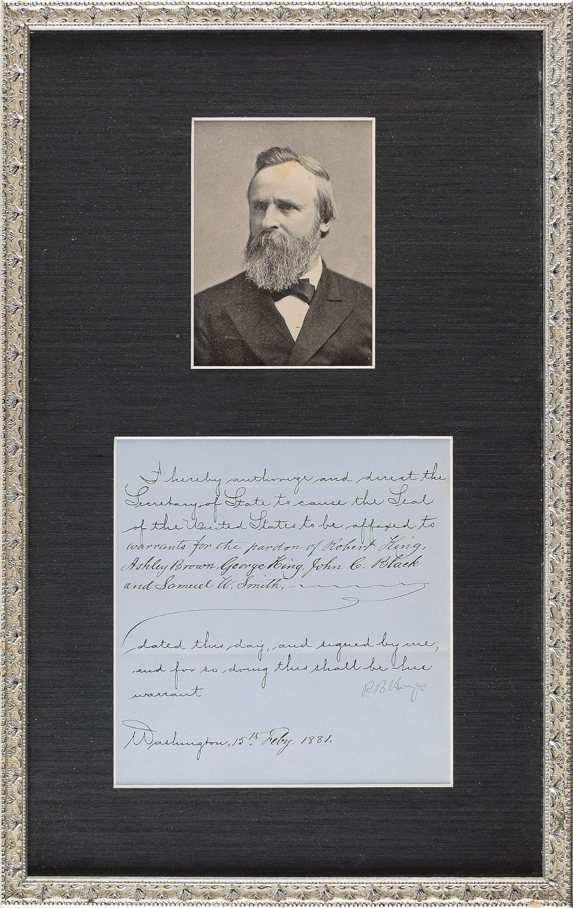 Partly-printed DS as president, signed “R. B. Hayes,” one page, 6.75 x 7, February 15, 1881. President Hayes authorizes and directs the "Secretary of State to cause the Seal of the United States to be affixed to warrants for the pardon of Robert King, Ashley Brown, George King, John C. Black, and Samuel W. Smith." Matted and framed with a portrait to an overall size of 11.5 x 18.5. In fine condition.