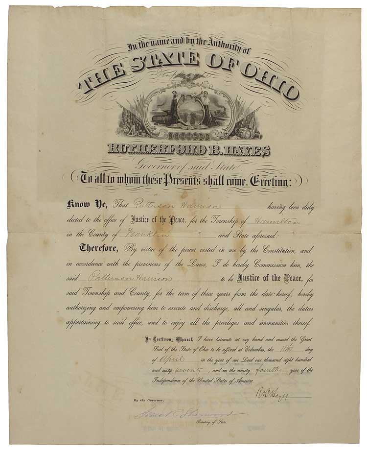 Partly-printed DS, signed “R. B. Hayes,” one page, 13.75 x 17, April 11, 1867. Hayes, as governor of Ohio, appoints Patterson Harrison a Justice of the Peace for Hamilton Township. Signed at the conclusion in black ink by Hayes, and countersigned by his secretary of state. In very good condition, with intersecting storage folds, scattered toning and foxing, rippling to top edge, and a trivial pinhole at one fold intersection. Pre-certified John Reznikoff/PSA/DNA and RRAuction COA.